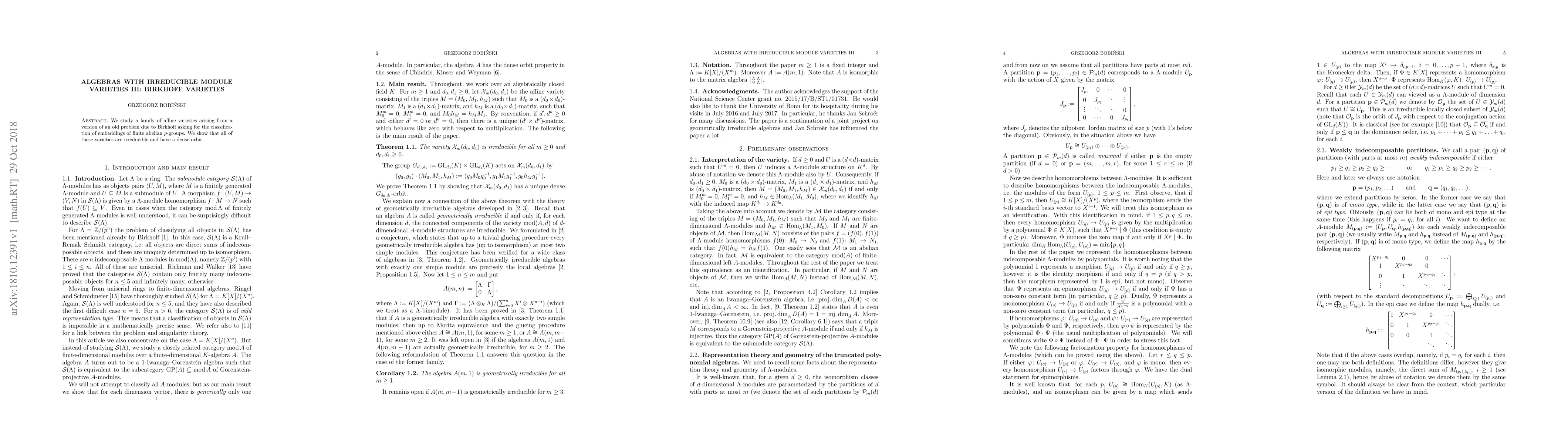 We study a family of affine varieties arising from a version of an old problem due to Birkhoff asking for the classification of embeddings of finite abelian p-groups. We show that all of these varieties are irreducible and have a dense orbit.