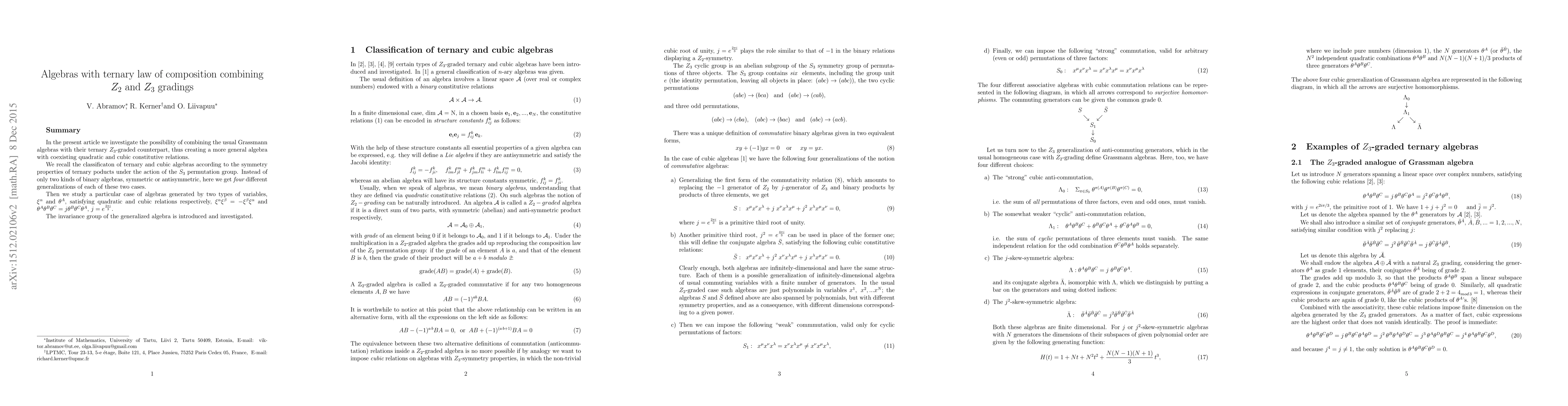 In the present article we investigate the possibility of combining the usual Grassmann algebras with their ternary Z_3-graded counterpart, thus creating a more general algebra with coexisting quadratic and cubic constitutive relations. We recall the classification of ternary and cubic algebras according to the symmetry properties of ternary products under the action of the S_3 permutation group. Instead of only two kinds of binary algebras, symmetric or antisymmetric, here we get four different generalizations of each of these two cases. Then we study a particular case of algebras generated by two types of variables, the generators of Grassmann algebra and generators of ternary analog of Grassmann algebra, satisfying quadratic and cubic relations respectively, i.e. the generators of Grassmann algebra anticommute and a triple product of any three generators of a ternary analog of Grassmann algebra is equal to cyclic permutation of generators in this product multiplied by a primitive 3rd root of unity. The invariance group of the generalized algebra is introduced and investigated.
