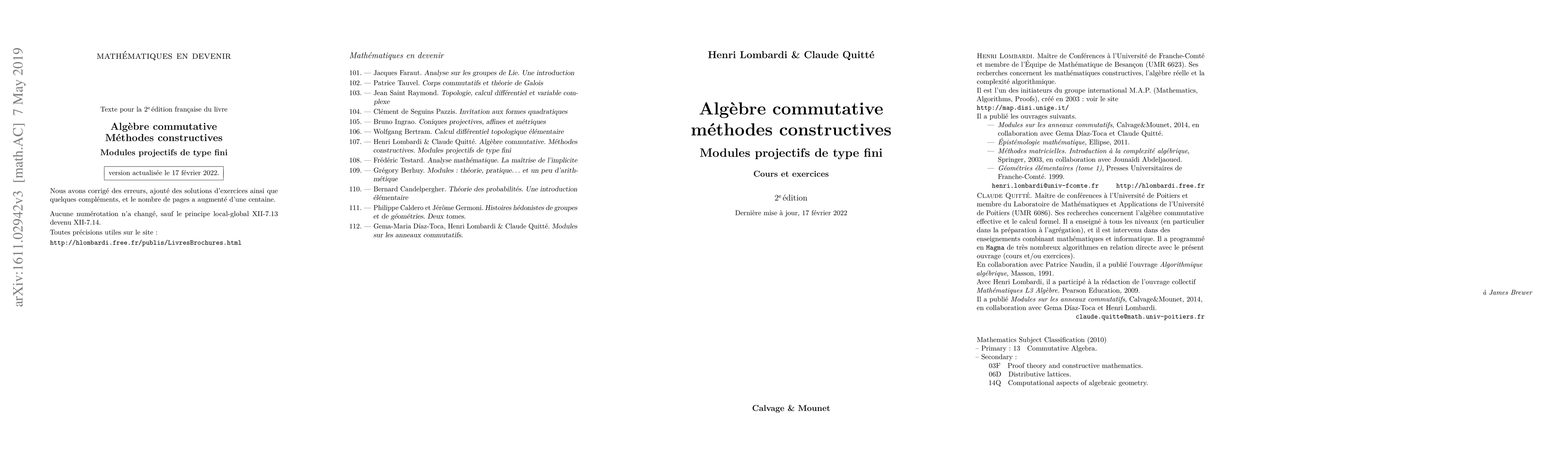 This book is an introductory course to basic commutative algebra with a particular emphasis on finitely generated projective modules, which constitutes the algebraic version of the vector bundles in differential geometry. We adopt the constructive point of view, with which all existence theorems have an explicit algorithmic content. In particular, when a theorem affirms the existence of an object -- the solution of a problem -- a construction algorithm of the object can always be extracted from the given proof. We revisit with a new and often simplifying eye several abstract classical theories. In particular, we review theories which did not have any algorithmic content in their general natural framework, such as Galois theory, the Dedekind rings, the finitely generated projective modules or the Krull dimension. Constructive algebra is actually an old discipline, developed among others by Gauss and Kronecker. We are in line with the modern "bible" on the subject, which is the book by Ray Mines, Fred Richman and Wim Ruitenburg, A Course in Constructive Algebra, published in 1988.