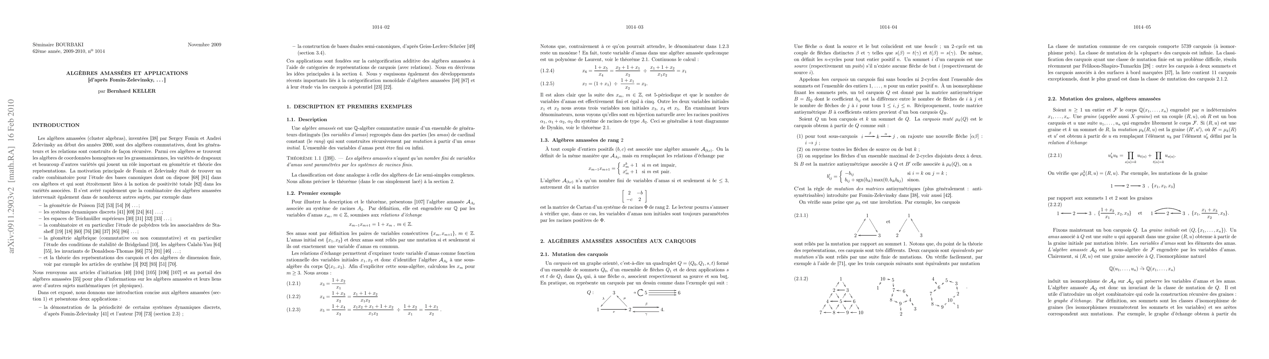 Sergey Fomin and Andrei Zelevinsky have invented cluster algebras at the beginning of this decade with the aim of creating an algebraic framework for the study of canonical bases in quantum groups and total positivity in algebraic groups. It soon turned out that the combinatorics of cluster algebras also appear in many other subjects and notably in the representation theory of quivers and finite-dimensional algebras. In this talk, we give a concise introduction to cluster algebras and sketch two significant applications concerning the study of certain discrete dynamical systems and the construction of dual semicanonical bases. ----- Sergey Fomin et Andrei Zelevinsky ont invent\'e les alg\`ebres amass\'ees (cluster algebras) au d\'ebut des ann\'ees 2000 dans le but de fournir un cadre alg\'ebrique \`a l'\'etude des bases canoniques dans les groupes quantiques et de la positivit\'e totale dans les groupes alg\'ebriques. Il s'est av\'er\'e rapidement que la combinatoire des alg\`ebres amass\'ees intervenait \'egalement dans de nombreux autres sujets et notamment en th\'eorie des repr\'esentations des carquois et des alg\`ebres de dimension finie. Dans cet expos\'e, nous donnons une introduction concise aux alg\`ebres amass\'ees et esquissons deux applications significatives portant sur l'\'etude de certains syst\`emes dynamiques discrets et la construction de bases duales semi-canoniques.