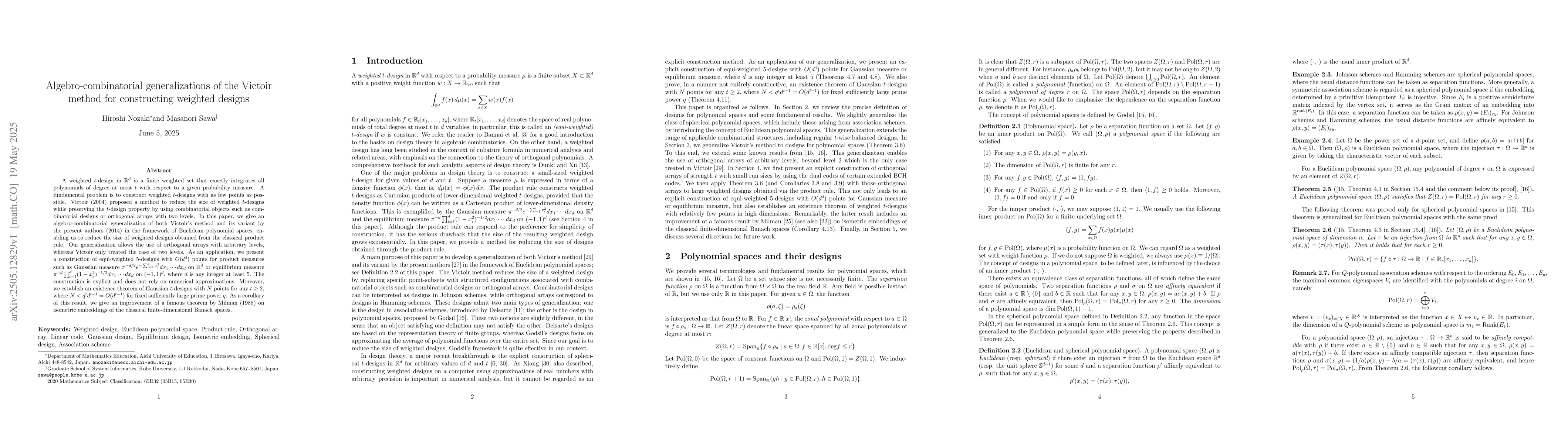 The paper presents an algebro-combinatorial generalization of Victoir's method and its variant, applied within Euclidean polynomial spaces to reduce the size of weighted designs derived from the classical product rule.