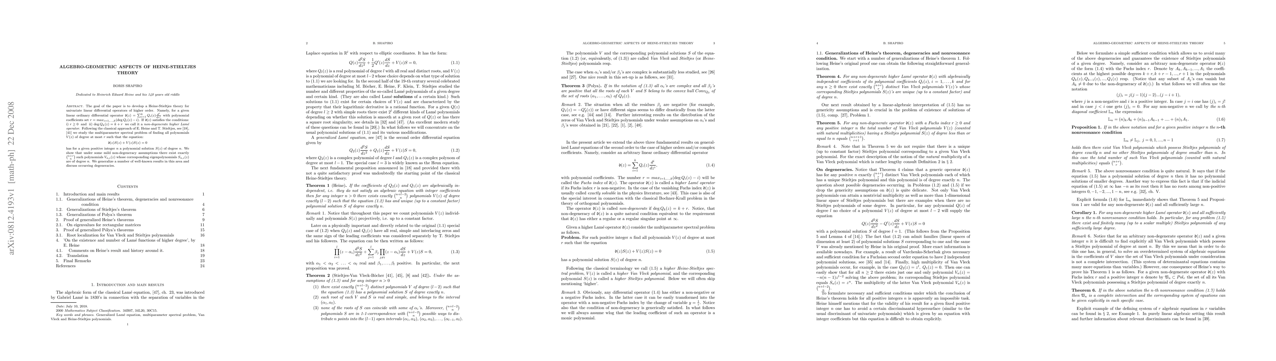 This paper develops a Heine-Stieltjes theory for higher-order linear differential operators with polynomial coefficients, focusing on finding polynomials V(z) that satisfy a specific differential equation under certain non-degeneracy conditions, and generalizes classical results in the field.