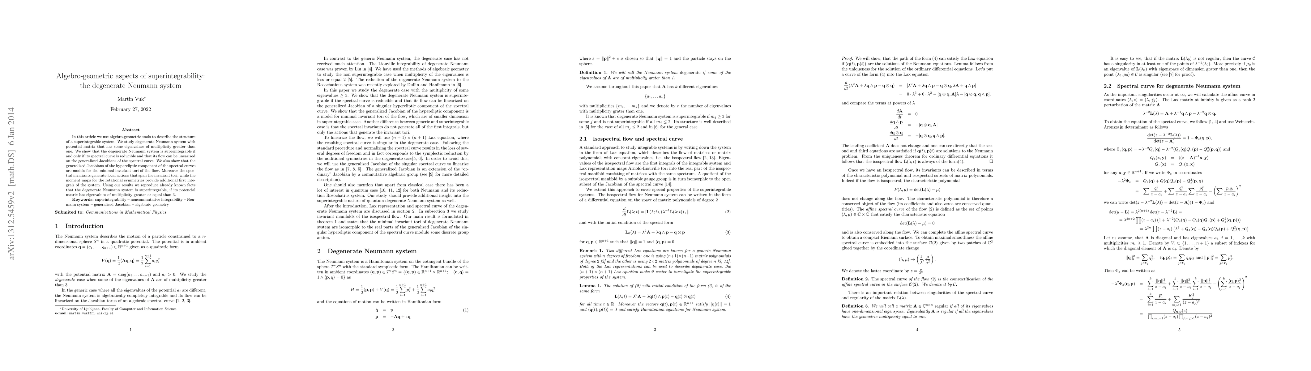 In this article we use algebro-geometric tools to describe the structure of a superintegrable system. We study degenerate Neumann system with potential matrix that has some eigenvalues of multiplicity greater than one. We show that the degenerate Neumann system is superintegrable if and only if its spectral curve is reducible and that its flow can be linearized on the generalized Jacobians of the spectral curve. We also show that the generalized Jacobians of the hypereliptic component of the spectral curves are models for the minimal invariant tori of the flow. Moreover the spectral invariants generate local actions that span the invariant tori, while the moment maps for the rotational symmetries provide additional first integrals of the system. Using our results we reproduce already known facts that the degenerate Neumann system is superintegrable, if its potencial matrix has eigenvalues of multiplicity greater or equal than $3$.