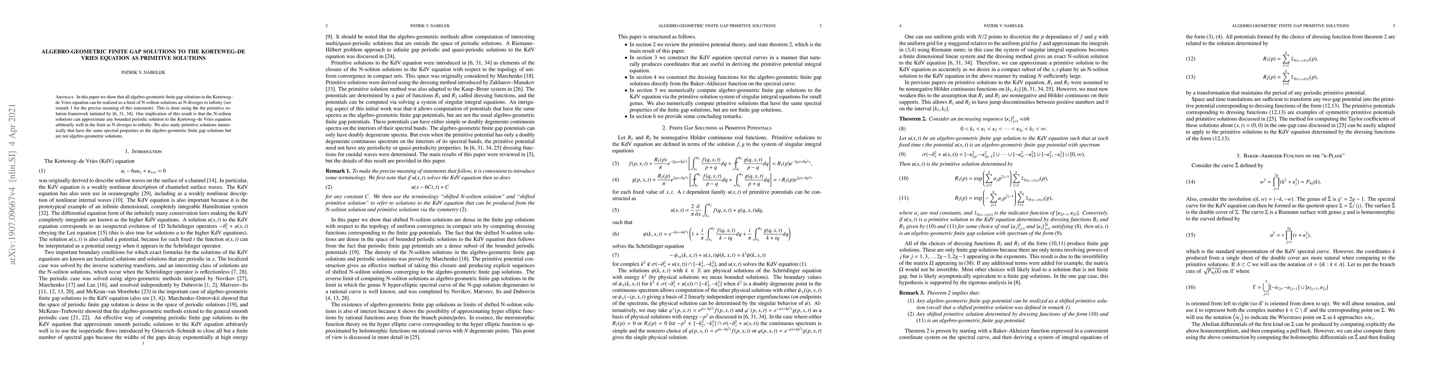 This paper demonstrates that all algebro-geometric finite gap solutions to the Korteweg-de Vries equation can be approximated by N-soliton solutions as N approaches infinity, using the primitive solution framework. It also explores non-algebro-geometric primitive solutions numerically that share spectral properties with the algebro-geometric solutions.