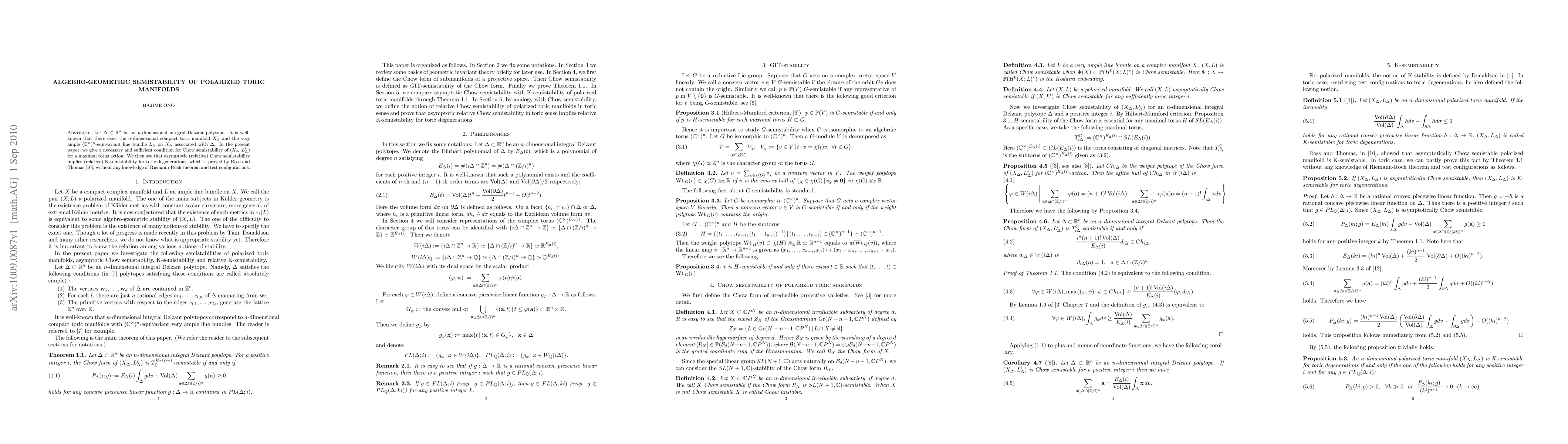 This paper establishes a necessary and sufficient condition for the Chow semistability of polarized toric manifolds $(X_\Delta, L_\Delta^i)$, where $L_\Delta$ is a line bundle associated with an $n$-dimensional integral Delzant polytope $\Delta$. It also demonstrates that asymptotic Chow semistability implies K-semistability for toric degenerations.