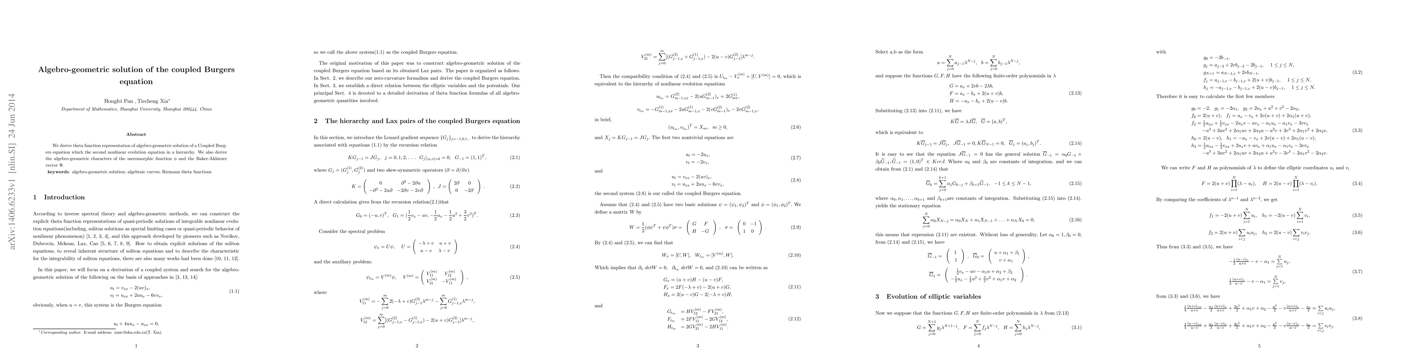 This paper presents a theta function representation of the algebro-geometric solution for a coupled Burgers equation, a second nonlinear evolution equation in a hierarchy. It also explores the algebro-geometric properties of the meromorphic function and the Baker-Akhiezer vector.