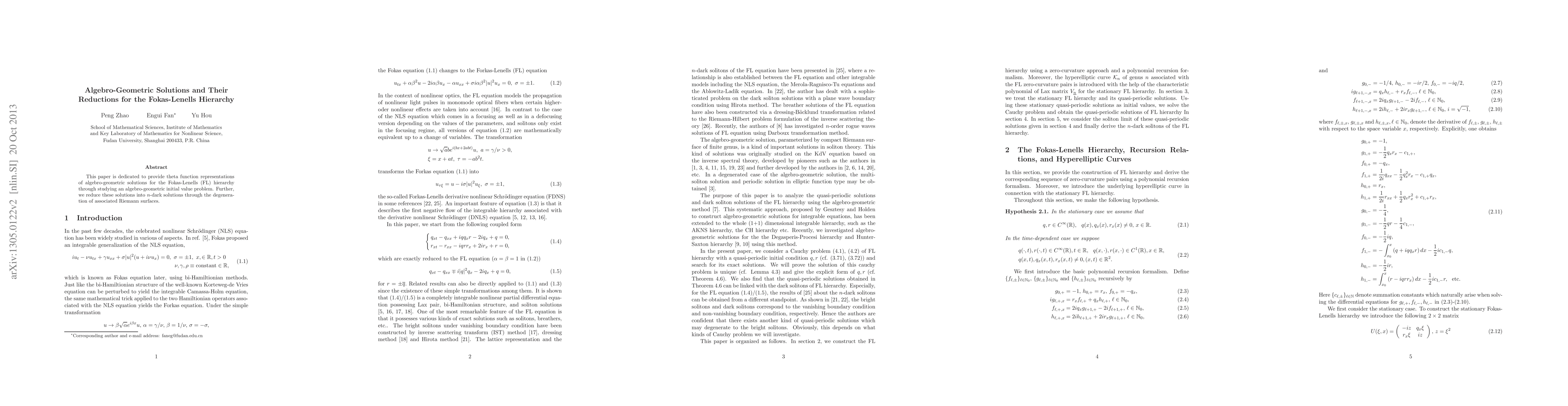 This paper presents theta function representations of algebro-geometric solutions for the Fokas-Lenells hierarchy and reduces these solutions into $N$-dark soliton solutions via the degeneration of associated Riemann surfaces.