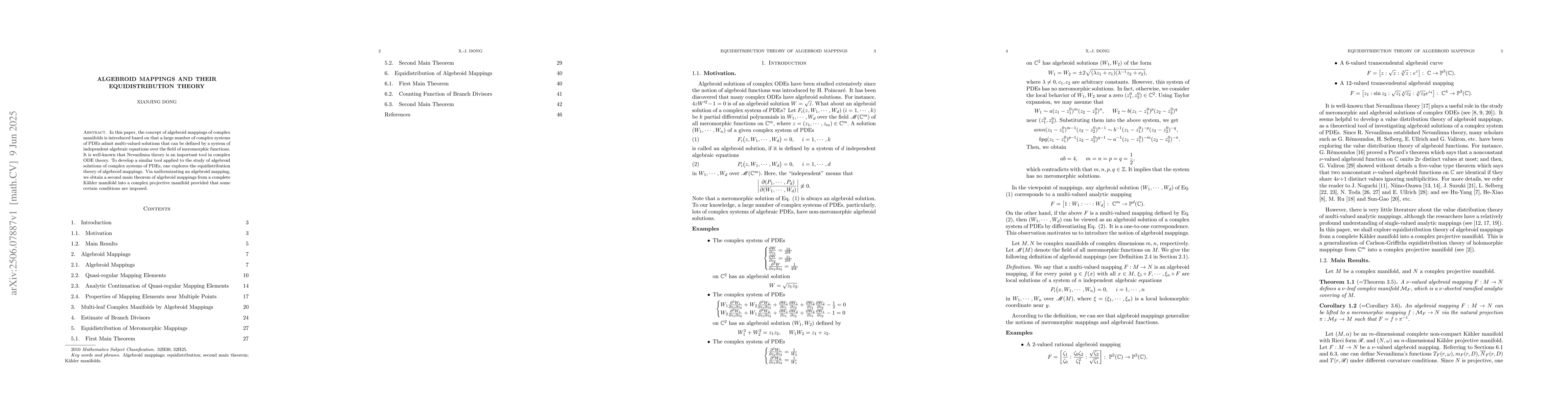 In this paper, the concept of algebroid mappings of complex manifolds is introduced based on that a large number of complex systems of PDEs admit multi-valued solutions that can be defined by a system of independent algebraic equations over the field of meromorphic functions. It is well-known that Nevanlinna theory is an important tool in complex ODE theory. To develop a similar tool applied to the study of algebroid solutions of complex systems of PDEs, one explores the equidistribution theory of algebroid mappings. Via uniformizating an algebroid mapping, we obtain a second main theorem of algebroid mappings from a complete K\"ahler manifold into a complex projective manifold provided that some certain conditions are imposed.