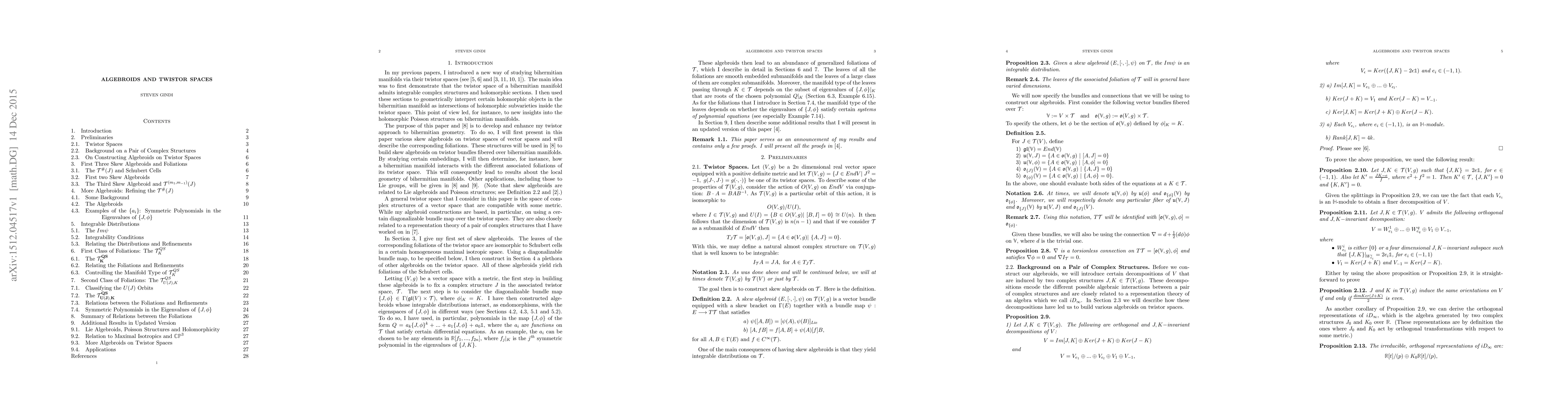 We introduce a plethora of skew algebroids on twistor spaces and describe the corresponding foliations. In a forthcoming paper, we use these algebroids to derive results about bihermitian manifolds, also known as generalized Kahler manifolds.