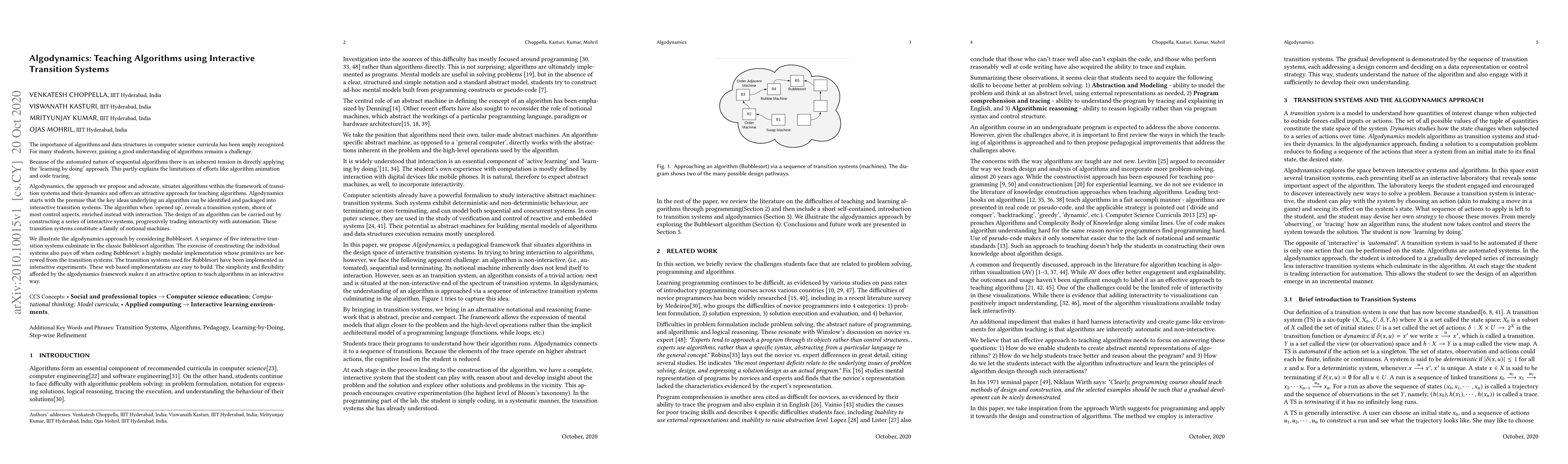 Algodynamics teaches algorithms using interactive transition systems, offering a new approach to learning algorithms that combines interactivity with automation, making it an attractive option for teaching algorithms in an engaging way.