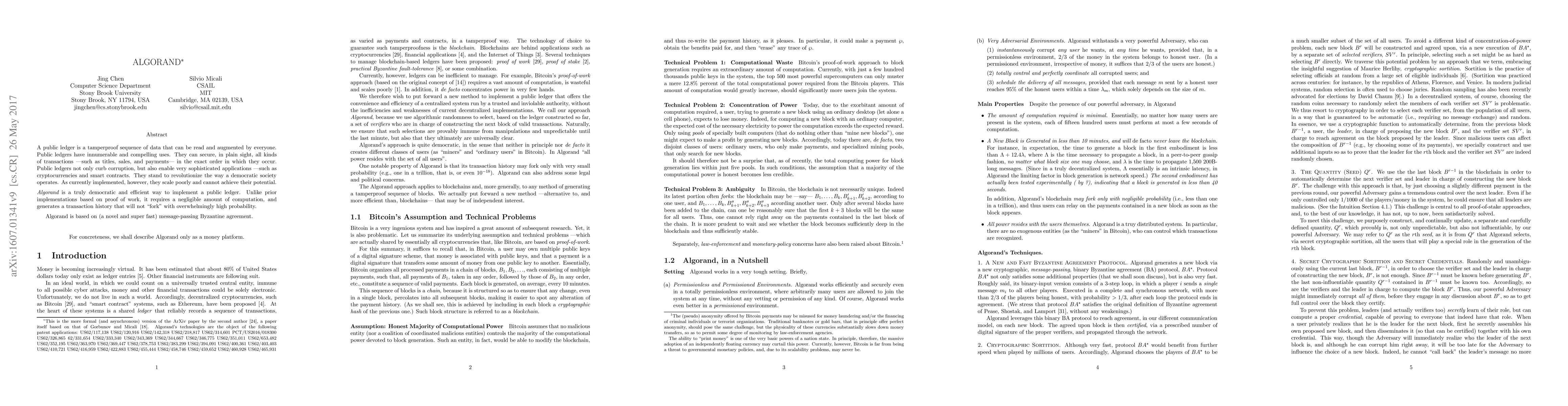 A public ledger is a tamperproof sequence of data that can be read and augmented by everyone. Public ledgers have innumerable and compelling uses. They can secure, in plain sight, all kinds of transactions ---such as titles, sales, and payments--- in the exact order in which they occur. Public ledgers not only curb corruption, but also enable very sophisticated applications ---such as cryptocurrencies and smart contracts. They stand to revolutionize the way a democratic society operates. As currently implemented, however, they scale poorly and cannot achieve their potential. Algorand is a truly democratic and efficient way to implement a public ledger. Unlike prior implementations based on proof of work, it requires a negligible amount of computation, and generates a transaction history that will not "fork" with overwhelmingly high probability. Algorand is based on (a novel and super fast) message-passing Byzantine agreement. For concreteness, we shall describe Algorand only as a money platform.