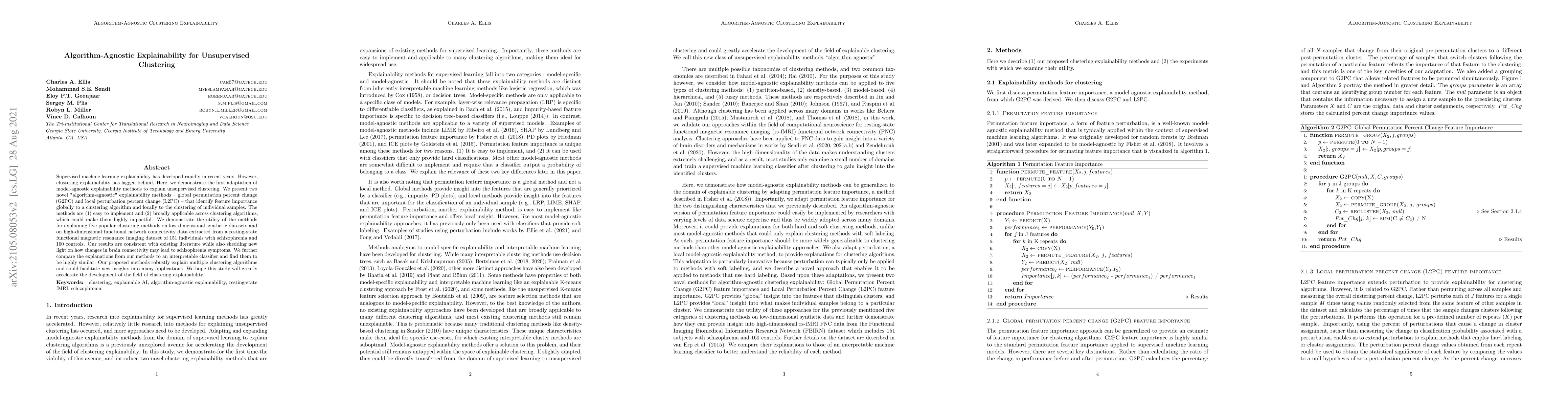 This study introduces two algorithm-agnostic explainability methods for unsupervised clustering, demonstrating their utility in explaining popular clustering algorithms on various datasets, including those related to schizophrenia.