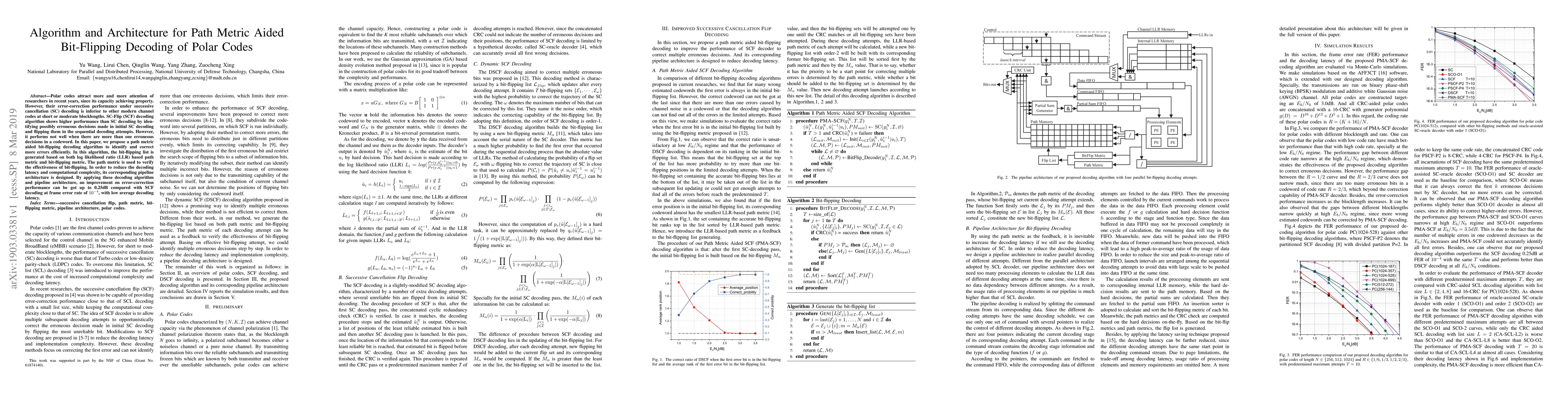 This paper proposes a path metric aided bit-flipping decoding algorithm for polar codes to improve error-correction performance over successive cancellation decoding, especially when multiple errors are present. The algorithm leverages both LLR-based path metrics and bit-flipping metrics to efficiently identify and correct errors, and a corresponding pipeline architecture is designed to reduce latency and complexity.