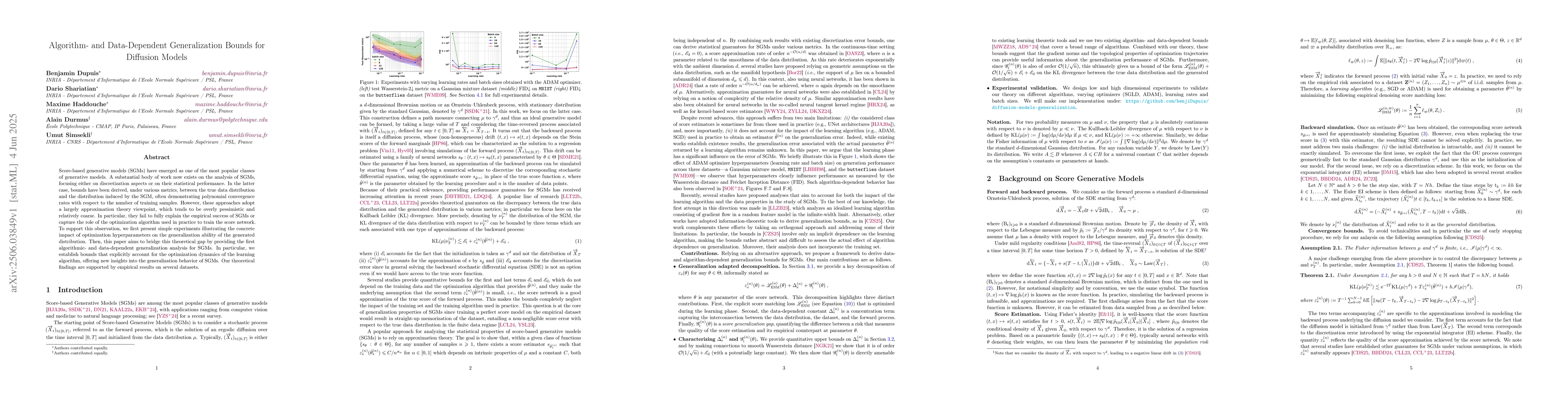 The paper presents the first algorithmic- and data-dependent generalization bounds for SGMs, incorporating optimization algorithm dynamics into the analysis.