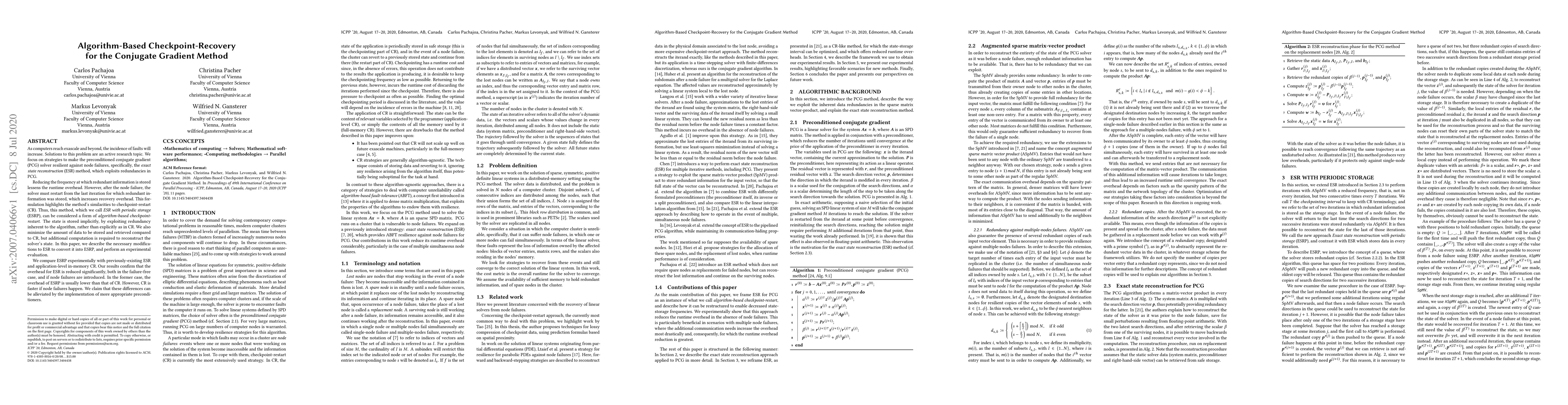 As computers reach exascale and beyond, the incidence of faults will increase. Solutions to this problem are an active research topic. We focus on strategies to make the preconditioned conjugate gradient (PCG) solver resilient against node failures, specifically, the exact state reconstruction (ESR) method, which exploits redundancies in PCG. Reducing the frequency at which redundant information is stored lessens the runtime overhead. However, after the node failure, the solver must restart from the last iteration for which redundant information was stored, which increases recovery overhead. This formulation highlights the method's similarities to checkpoint-restart (CR). Thus, this method, which we call ESR with periodic storage (ESRP), can be considered a form of algorithm-based checkpoint-restart. The state is stored implicitly, by exploiting redundancy inherent to the algorithm, rather than explicitly as in CR. We also minimize the amount of data to be stored and retrieved compared to CR, but additional computation is required to reconstruct the solver's state. In this paper, we describe the necessary modifications to ESR to convert it into ESRP, and perform an experimental evaluation. We compare ESRP experimentally with previously-existing ESR and application-level in-memory CR. Our results confirm that the overhead for ESR is reduced significantly, both in the failure-free case, and if node failures are introduced. In the former case, the overhead of ESRP is usually lower than that of CR. However, CR is faster if node failures happen. We claim that these differences can be alleviated by the implementation of more appropriate preconditioners.