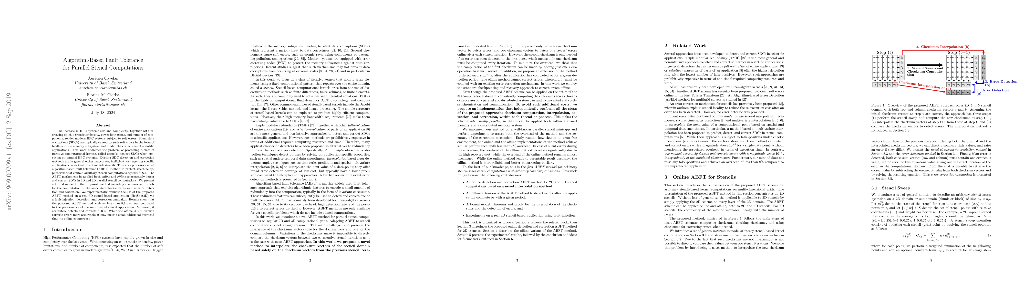 This paper proposes an algorithm-based fault tolerance (ABFT) method to protect parallel stencil computations against silent data corruptions (SDCs) in high-performance computing (HPC) systems. The ABFT method is shown to accurately detect and correct SDCs with less than 8% performance overhead, demonstrating its effectiveness for real-world 3D stencil applications.