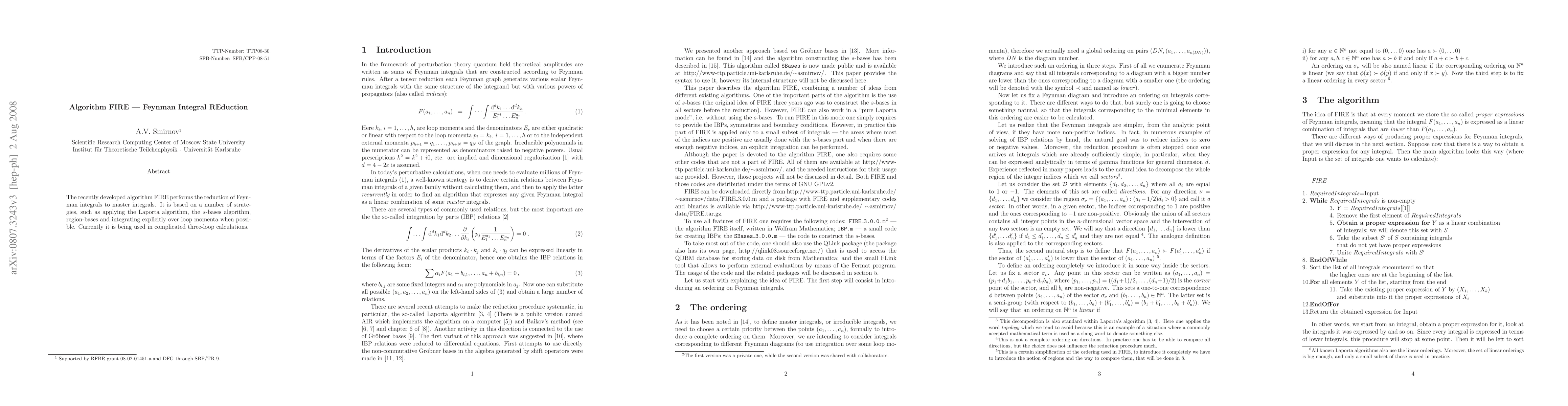 The FIRE algorithm reduces Feynman integrals to master integrals using techniques like the Laporta and s-bases algorithms, and is currently applied in intricate three-loop calculations. It integrates explicitly over loop momenta where feasible to enhance efficiency.