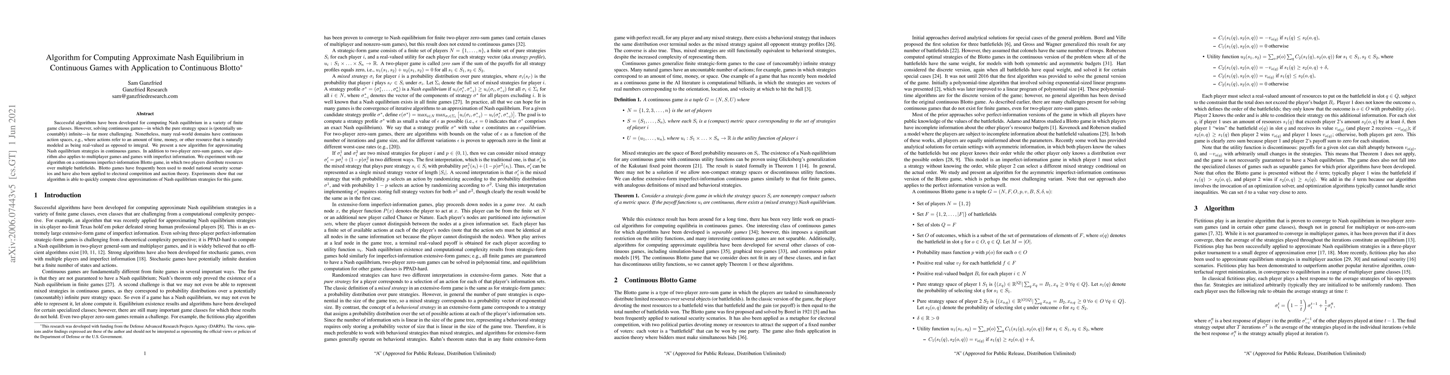 This paper introduces an algorithm for approximating Nash equilibrium in continuous games, applicable to both two-player zero-sum and multiplayer settings with imperfect information. The algorithm is tested on a continuous Blotto game, demonstrating its ability to efficiently compute near-optimal strategies.