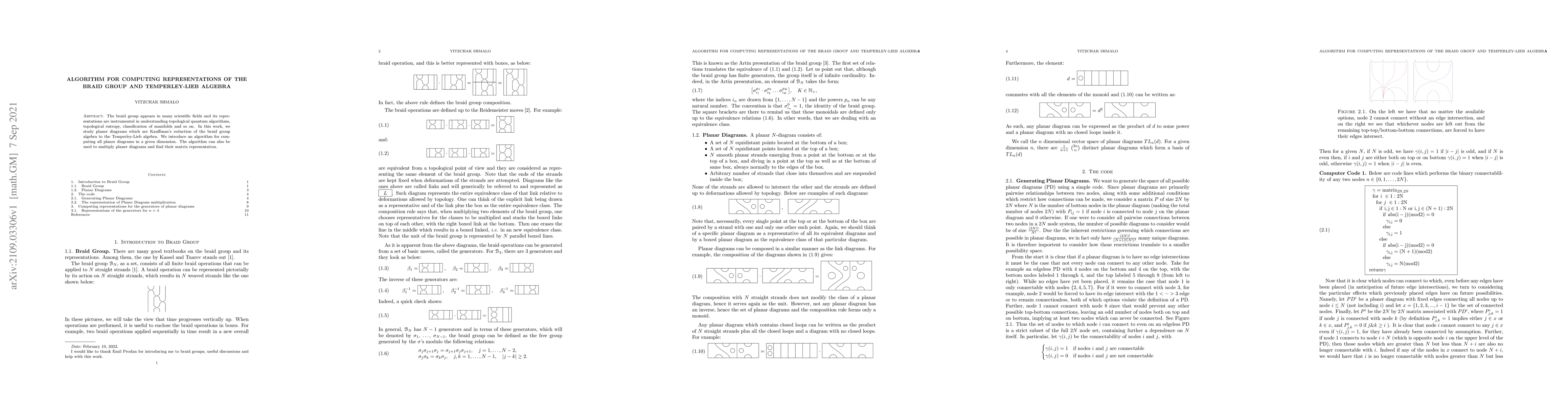 The braid group appears in many scientific fields and its representations are instrumental in understanding topological quantum algorithms, topological entropy, classification of manifolds and so on. In this work, we study planer diagrams which are Kauffman's reduction of the braid group algebra to the Temperley-Lieb algebra. We introduce an algorithm for computing all planer diagrams in a given dimension. The algorithm can also be used to multiply planer diagrams and find their matrix representation.