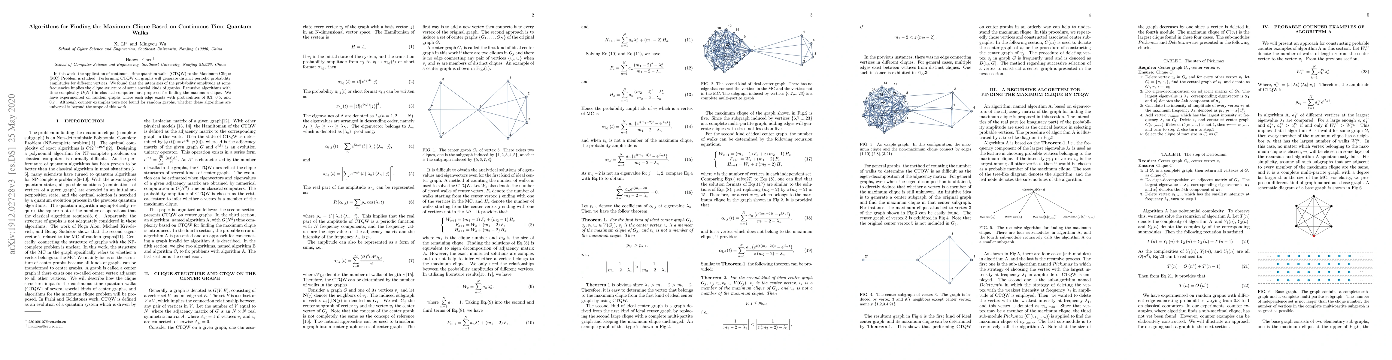 This paper explores the use of continuous time quantum walking (CTQW) to solve the Maximum Clique Problem, demonstrating that the probability amplitude intensity at specific frequencies reveals clique structures in certain types of graphs. It proposes recursive algorithms with a time complexity of $O(N^5)$ for classical computers, tested on random graphs with varying edge probabilities.