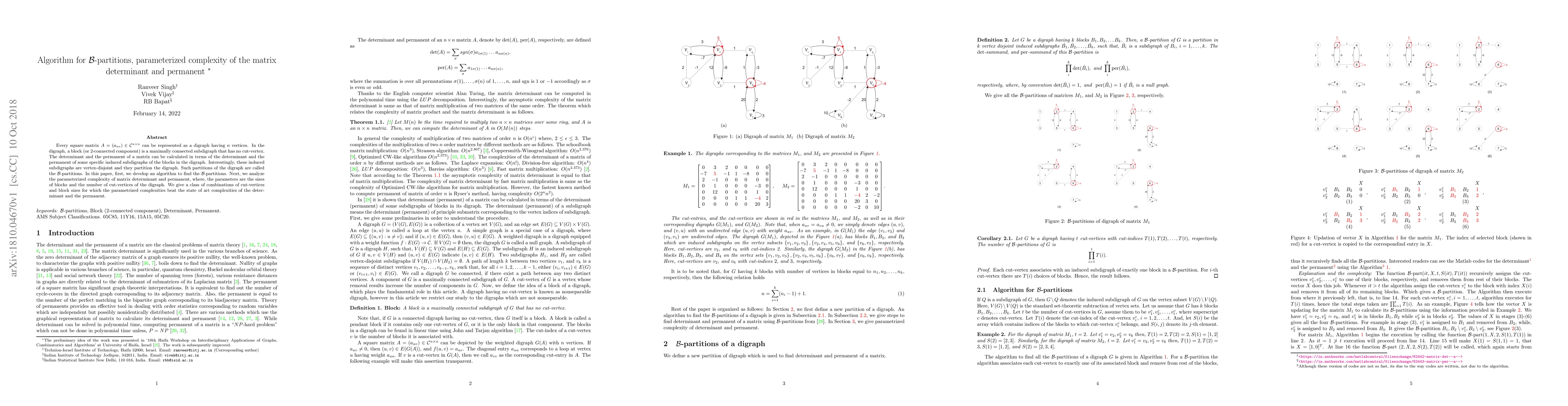 This paper develops an algorithm to identify $\mathcal{B}$-partitions in digraphs derived from square matrices, and analyzes the parameterized complexity of calculating the matrix determinant and permanent, achieving better complexities for certain combinations of block sizes and cut-vertices.