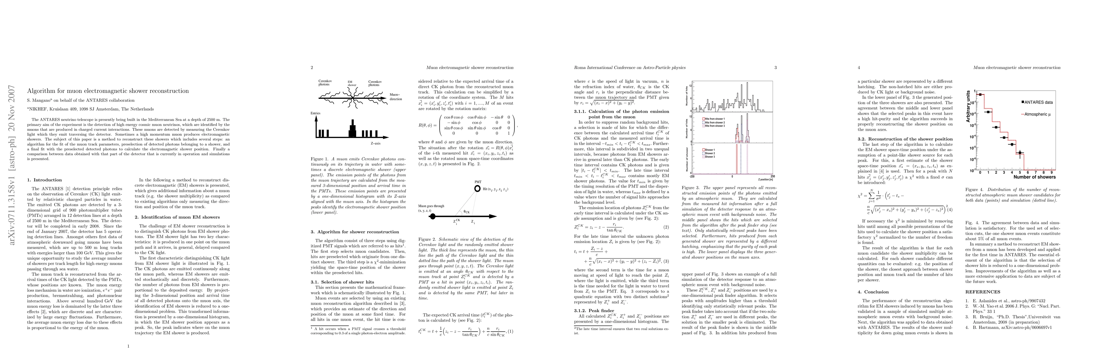 This paper presents an algorithm for reconstructing electromagnetic showers produced by high-momentum muons in the ANTARES neutrino telescope, involving track parameter fitting, photon preselection, and a final fit to determine shower position, followed by a comparison with operational detector data and simulations.