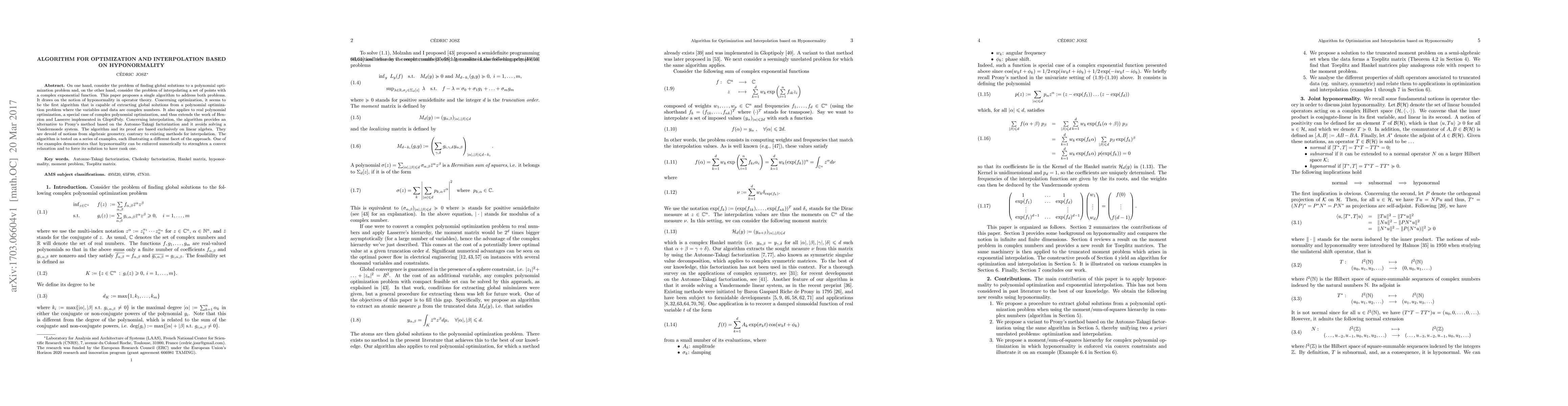 On one hand, consider the problem of finding global solutions to a polynomial optimization problem and, on the other hand, consider the problem of interpolating a set of points with a complex exponential function. This paper proposes a single algorithm to address both problems. It draws on the notion of hyponormality in operator theory. Concerning optimization, it seems to be the first algorithm that is capable of extracting global solutions from a polynomial optimization problem where the variables and data are complex numbers. It also applies to real polynomial optimization, a special case of complex polynomial optimization, and thus extends the work of Henrion and Lasserre implemented in GloptiPoly. Concerning interpolation, the algorithm provides an alternative to Prony's method based on the Autonne-Takagi factorization and it avoids solving a Vandermonde system. The algorithm and its proof are based exclusively on linear algebra. They are devoid of notions from algebraic geometry, contrary to existing methods for interpolation. The algorithm is tested on a series of examples, each illustrating a different facet of the approach. One of the examples demonstrates that hyponormality can be enforced numerically to strenghten a convex relaxation and to force its solution to have rank one.