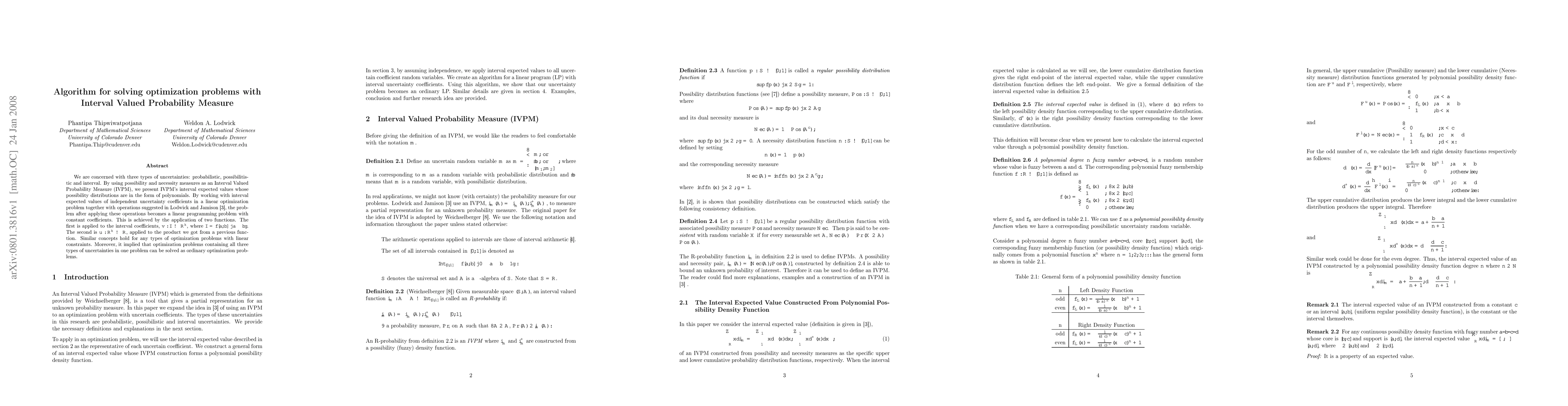 We are concerned with three types of uncertainties: probabilistic, possibilitistic and interval. By using possibility and necessity measures as an Interval Valued Probability Measure (IVPM), we present IVPM's interval expected values whose possibility distributions are in the form of polynomials. By working with interval expected values of independent uncertainty coefficients in a linear optimization problem together with operations suggested in Lodwick and Jamison (2007), the problem after applying these operations becomes a linear programming problem with constant coefficients. This is achieved by the application of two functions. The first is applied to the interval coefficients, v: I -> R^k, where I= {[a,b] | a <= b}. The second is u: R^k -> R, applied to the product we got from a previous function. Similar concepts hold for any types of optimization problems with linear constraints. Moreover, it implied that optimization problems containing all three types of uncertainties in one problem can be solved as ordinary optimization problems.