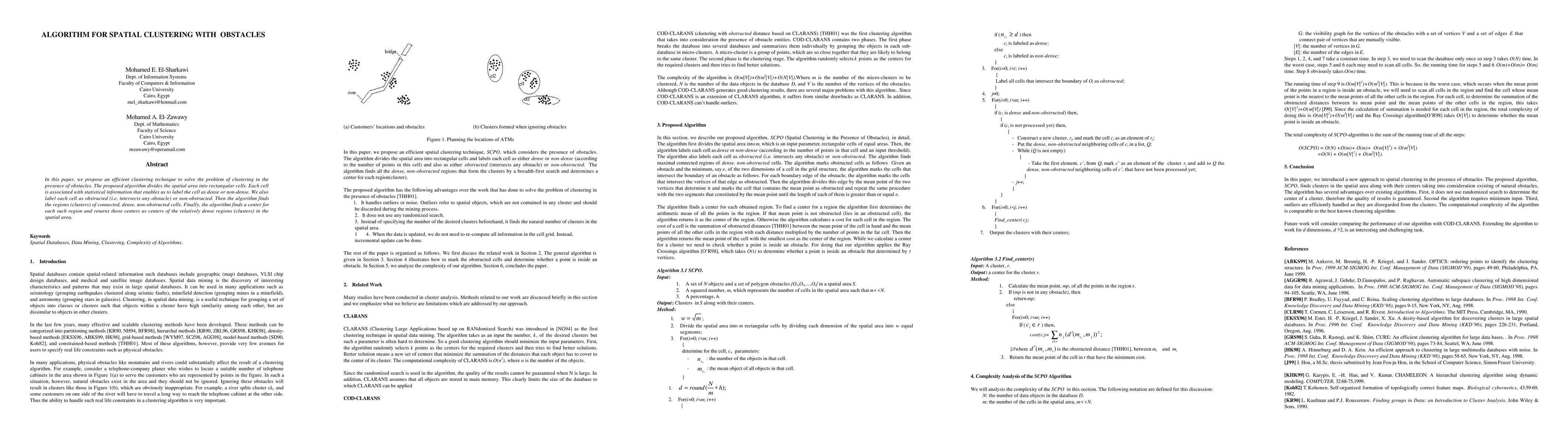 Researchers propose an algorithm to efficiently cluster data in areas with obstacles by dividing space into cells, labeling their density and obstruction status, then identifying connected dense non-obstructed regions with their centers.