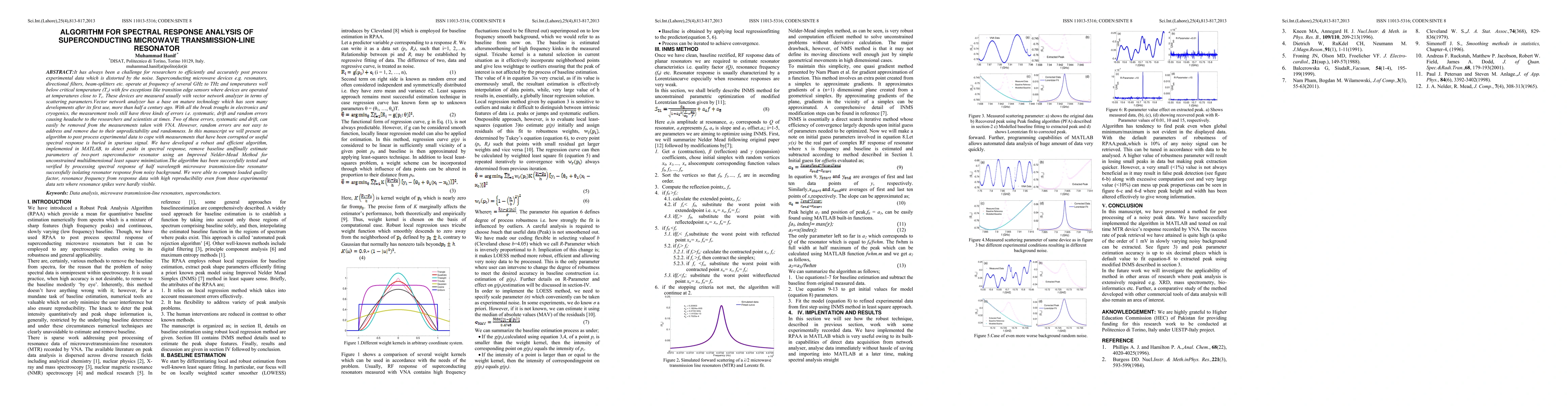 It has always been a challenge for researchers to efficiently and accurately post process experimental data which is distorted by the noise. Superconducting microwave devices e.g. resonators, directional filters, beam-splitters etc. operate at frequency of several GHz to THz and temperatures well below critical temperature (Tc) with few exceptions like transition edge sensors where devices are operated at temperatures close to Tc. These devices are measured usually with vector network analyser in terms of scattering parameters. Two kinds of errors, systematic and drift can easily be removed from the measurements taken with VNA. However, random errors are not easy to address and remove due to their unpredictability and randomness. In this manuscript we will present an algorithm to post process experimental data to cope with measurements that have been corrupted or useful spectral response is buried in spurious signal. We have developed a robust and efficient algorithm, implemented in MATLAB, to detect peaks in spectral response, remove baseline and finally estimate parameters of two-port superconductor resonator using an Improved Nelder-Mead Method for unconstrained multidimensional least square minimization. The algorithm has been successfully tested and verified by processing spectral response of half wavelength microwave transmission-line resonator successfully isolating resonator response from noisy background. We were able to compute loaded quality factor, resonance frequency from response data with high reproducibility even from those experimental data sets where resonance spikes were hardly visible.
