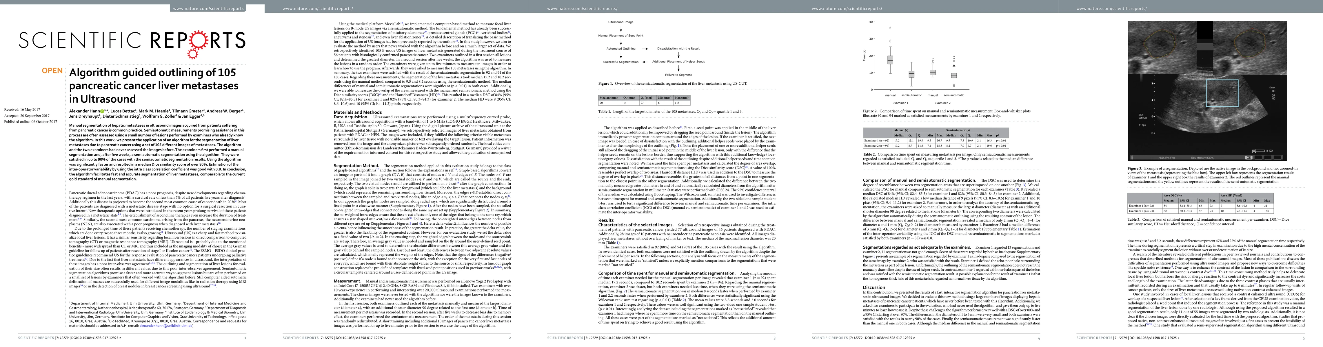 Manual segmentation of hepatic metastases in ultrasound images acquired from patients suffering from pancreatic cancer is common practice. Semiautomatic measurements promising assistance in this process are often assessed using a small number of lesions performed by examiners who already know the algorithm. In this work, we present the application of an algorithm for the segmentation of liver metastases due to pancreatic cancer using a set of 105 different images of metastases. The algorithm and the two examiners had never assessed the images before. The examiners first performed a manual segmentation and, after five weeks, a semiautomatic segmentation using the algorithm. They were satisfied in up to 90% of the cases with the semiautomatic segmentation results. Using the algorithm was significantly faster and resulted in a median Dice similarity score of over 80%. Estimation of the inter-operator variability by using the intra class correlation coefficient was good with 0.8. In conclusion, the algorithm facilitates fast and accurate segmentation of liver metastases, comparable to the current gold standard of manual segmentation.