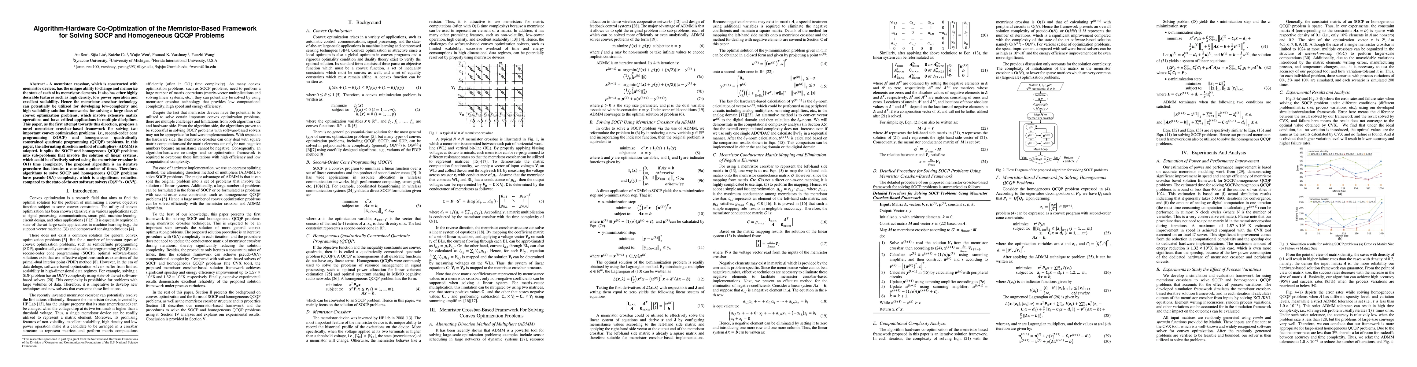 This paper proposes a novel memristor crossbar-based framework for solving second-order cone programming (SOCP) and homogeneous quadratically constrained quadratic programming (QCQP) problems using the alternating direction method of multipliers (ADMM). The framework leverages the memristor crossbar's unique properties to achieve pseudo-O(N) complexity, significantly outperforming traditional software solvers.