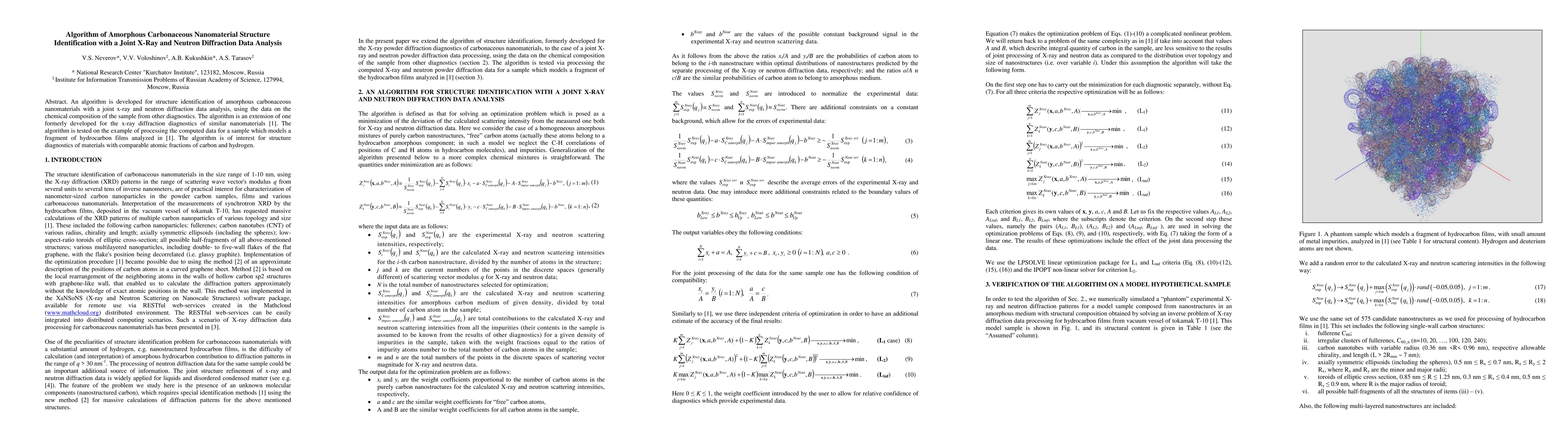 This paper presents an algorithm for identifying the structure of amorphous carbonaceous nanomaterials using joint X-ray and neutron diffraction data analysis, extending a previous x-ray-based method. The algorithm incorporates chemical composition data from other diagnostics and is tested on a modeled hydrocarbon film sample.