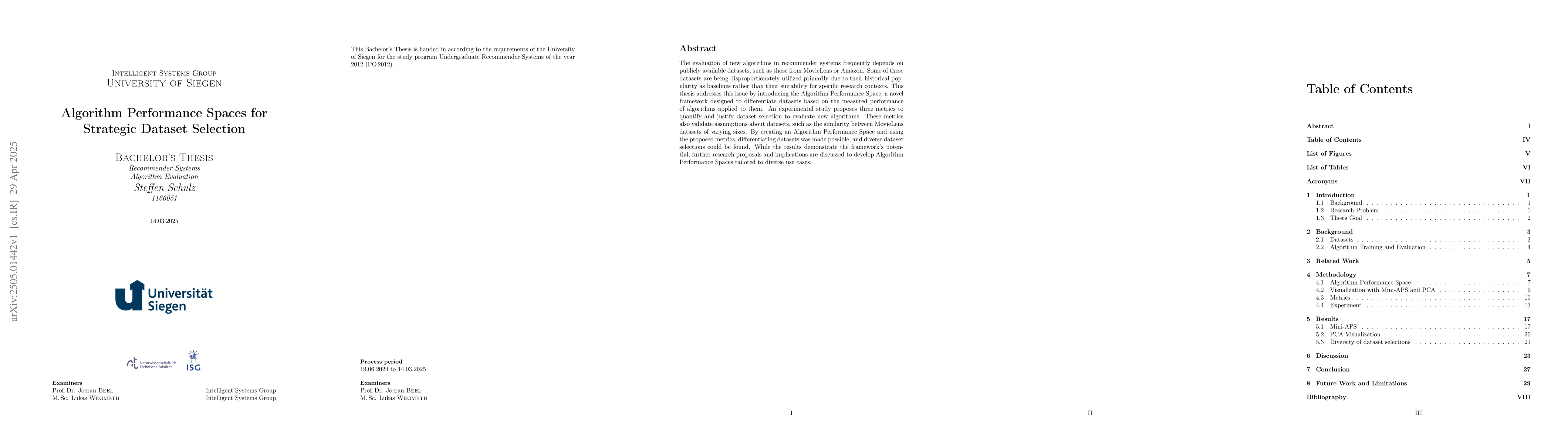 The evaluation of new algorithms in recommender systems frequently depends on publicly available datasets, such as those from MovieLens or Amazon. Some of these datasets are being disproportionately utilized primarily due to their historical popularity as baselines rather than their suitability for specific research contexts. This thesis addresses this issue by introducing the Algorithm Performance Space, a novel framework designed to differentiate datasets based on the measured performance of algorithms applied to them. An experimental study proposes three metrics to quantify and justify dataset selection to evaluate new algorithms. These metrics also validate assumptions about datasets, such as the similarity between MovieLens datasets of varying sizes. By creating an Algorithm Performance Space and using the proposed metrics, differentiating datasets was made possible, and diverse dataset selections could be found. While the results demonstrate the framework's potential, further research proposals and implications are discussed to develop Algorithm Performance Spaces tailored to diverse use cases.