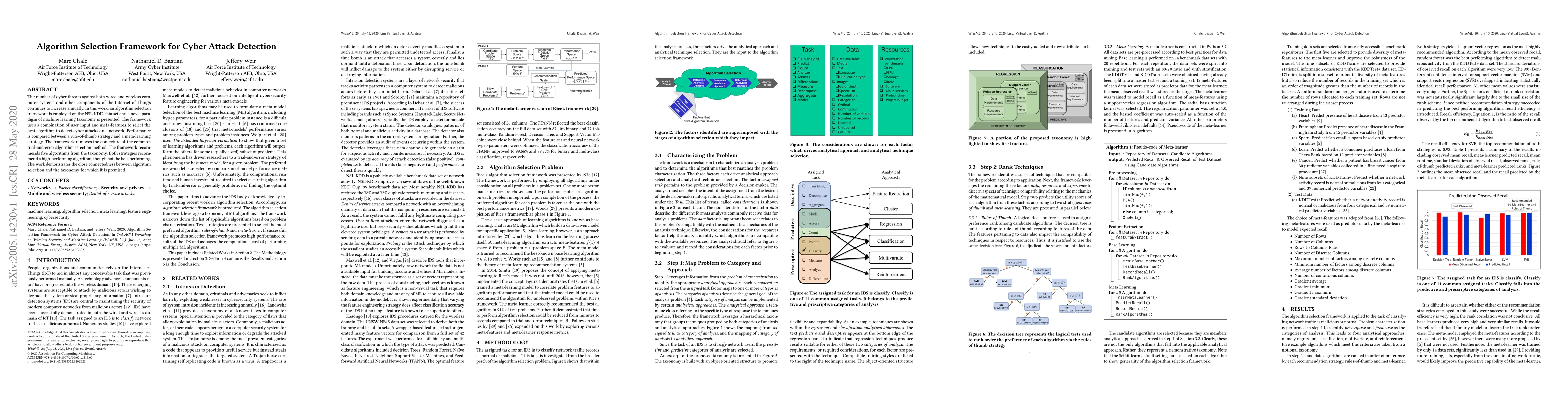 The number of cyber threats against both wired and wireless computer systems and other components of the Internet of Things continues to increase annually. In this work, an algorithm selection framework is employed on the NSL-KDD data set and a novel paradigm of machine learning taxonomy is presented. The framework uses a combination of user input and meta-features to select the best algorithm to detect cyber attacks on a network. Performance is compared between a rule-of-thumb strategy and a meta-learning strategy. The framework removes the conjecture of the common trial-and-error algorithm selection method. The framework recommends five algorithms from the taxonomy. Both strategies recommend a high-performing algorithm, though not the best performing. The work demonstrates the close connectedness between algorithm selection and the taxonomy for which it is premised.