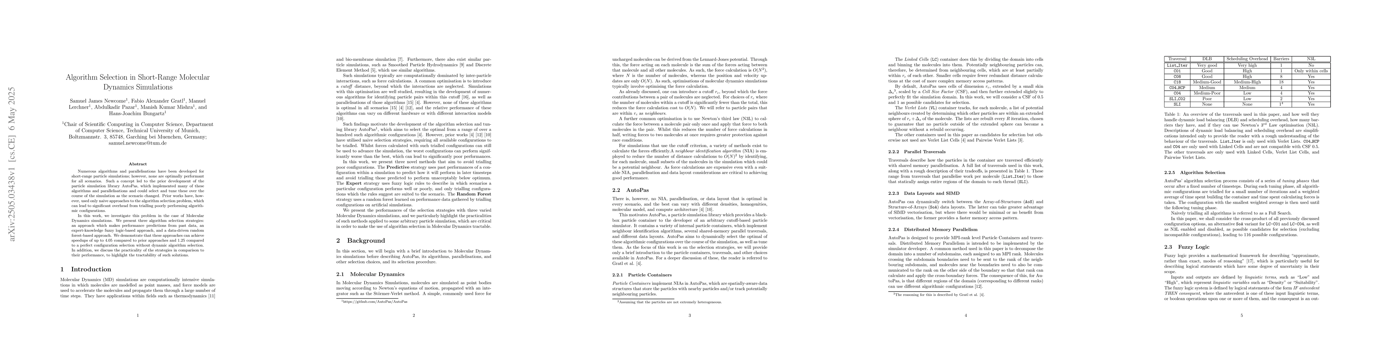 Researchers developed three algorithm selection strategies for Molecular Dynamics simulations, achieving speedups of up to 4.05 compared to previous approaches, and highlighted the tractability of such solutions.