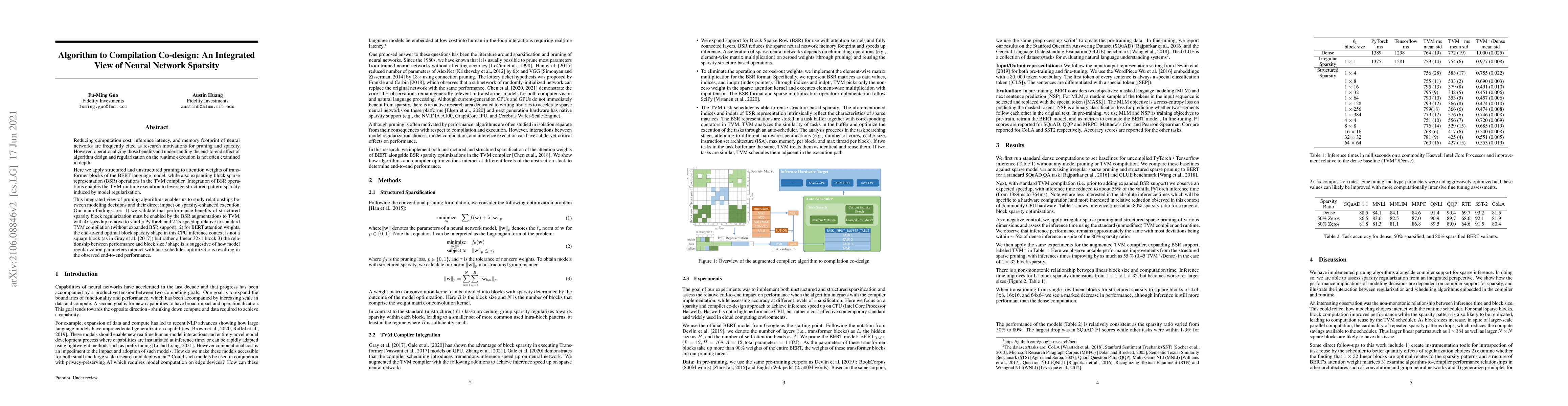 Reducing computation cost, inference latency, and memory footprint of neural networks are frequently cited as research motivations for pruning and sparsity. However, operationalizing those benefits and understanding the end-to-end effect of algorithm design and regularization on the runtime execution is not often examined in depth. Here we apply structured and unstructured pruning to attention weights of transformer blocks of the BERT language model, while also expanding block sparse representation (BSR) operations in the TVM compiler. Integration of BSR operations enables the TVM runtime execution to leverage structured pattern sparsity induced by model regularization. This integrated view of pruning algorithms enables us to study relationships between modeling decisions and their direct impact on sparsity-enhanced execution. Our main findings are: 1) we validate that performance benefits of structured sparsity block regularization must be enabled by the BSR augmentations to TVM, with 4x speedup relative to vanilla PyTorch and 2.2x speedup relative to standard TVM compilation (without expanded BSR support). 2) for BERT attention weights, the end-to-end optimal block sparsity shape in this CPU inference context is not a square block (as in \cite{gray2017gpu}) but rather a linear 32x1 block 3) the relationship between performance and block size / shape is is suggestive of how model regularization parameters interact with task scheduler optimizations resulting in the observed end-to-end performance.