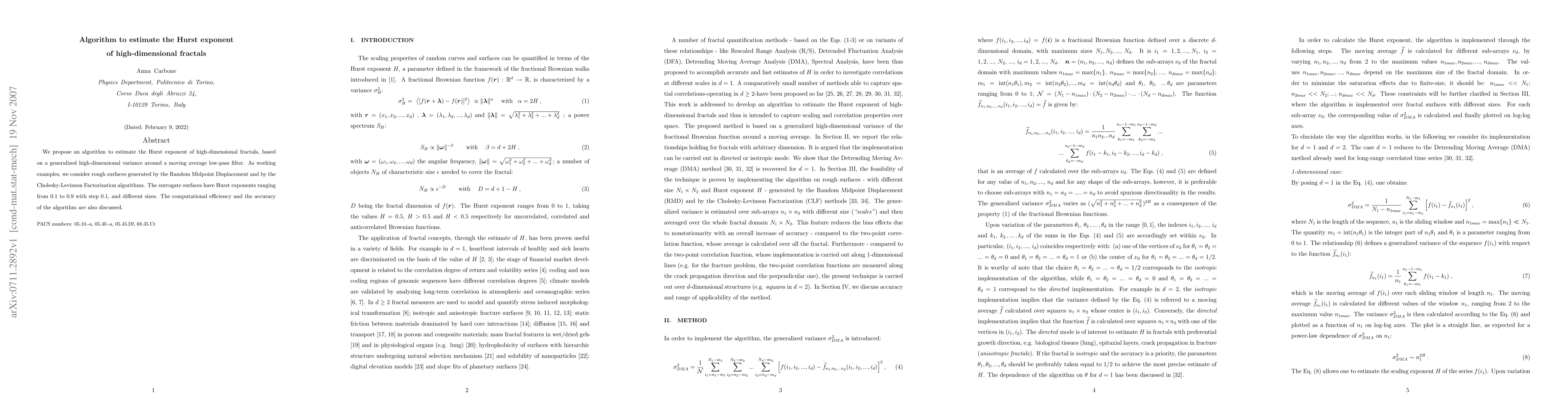 This paper introduces an algorithm for estimating the Hurst exponent of high-dimensional fractals using a generalized variance method around a moving average low-pass filter. The algorithm's efficiency and accuracy are demonstrated through examples of rough surfaces generated by Random Midpoint Displacement and Cholesky-Levinson Factorization algorithms.