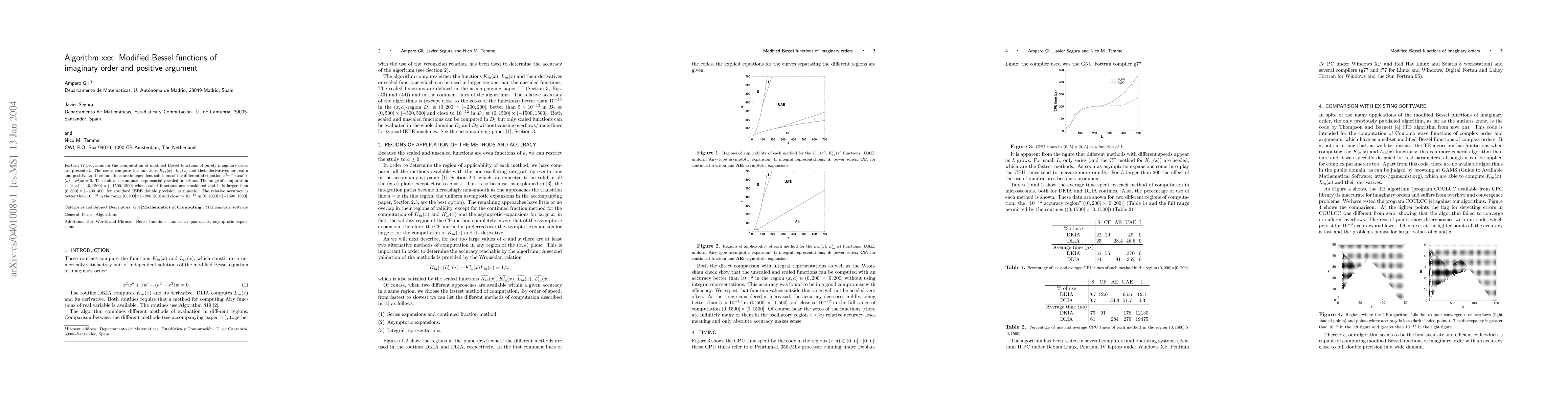 Fortran 77 programs for the computation of modified Bessel functions of purely imaginary order are presented. The codes compute the functions $K_{ia}(x)$, $L_{ia}(x)$ and their derivatives for real $a$ and positive $x$; these functions are independent solutions of the differential equation $x^2 w'' +x w' +(a^2 -x^2)w=0$. The code also computes exponentially scaled functions. The range of computation is $(x,a)\in (0,1500]\times [-1500,1500]$ when scaled functions are considered and it is larger than $(0,500]\times [-400,400]$ for standard IEEE double precision arithmetic. The relative accuracy is better than $10^{-13}$ in the range $(0,200]\times [-200,200]$ and close to $10^{-12}$ in $(0,1500]\times [-1500,1500]$.