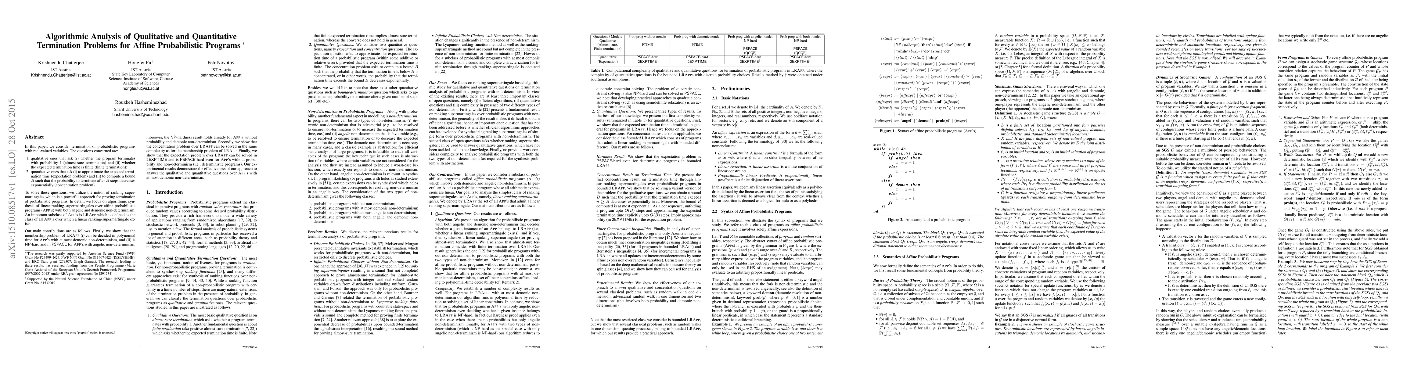 In this paper, we consider termination of probabilistic programs with real-valued variables. The questions concerned are: 1. qualitative ones that ask (i) whether the program terminates with probability 1 (almost-sure termination) and (ii) whether the expected termination time is finite (finite termination); 2. quantitative ones that ask (i) to approximate the expected termination time (expectation problem) and (ii) to compute a bound B such that the probability to terminate after B steps decreases exponentially (concentration problem). To solve these questions, we utilize the notion of ranking supermartingales which is a powerful approach for proving termination of probabilistic programs. In detail, we focus on algorithmic synthesis of linear ranking-supermartingales over affine probabilistic programs (APP's) with both angelic and demonic non-determinism. An important subclass of APP's is LRAPP which is defined as the class of all APP's over which a linear ranking-supermartingale exists. Our main contributions are as follows. Firstly, we show that the membership problem of LRAPP (i) can be decided in polynomial time for APP's with at most demonic non-determinism, and (ii) is NP-hard and in PSPACE for APP's with angelic non-determinism; moreover, the NP-hardness result holds already for APP's without probability and demonic non-determinism. Secondly, we show that the concentration problem over LRAPP can be solved in the same complexity as for the membership problem of LRAPP. Finally, we show that the expectation problem over LRAPP can be solved in 2EXPTIME and is PSPACE-hard even for APP's without probability and non-determinism (i.e., deterministic programs). Our experimental results demonstrate the effectiveness of our approach to answer the qualitative and quantitative questions over APP's with at most demonic non-determinism.