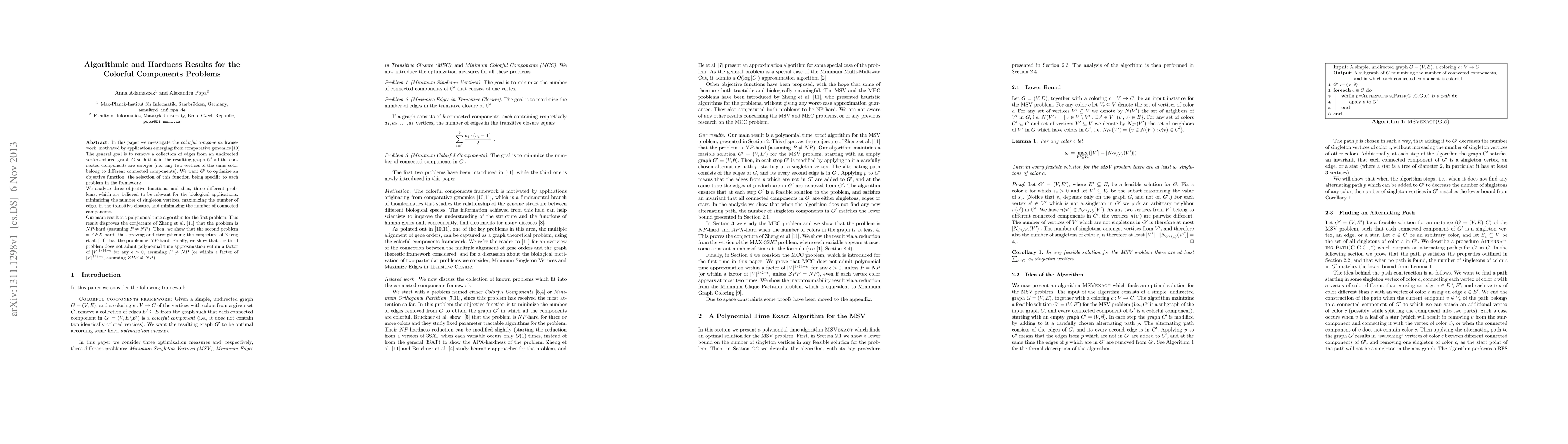 In this paper we investigate the colorful components framework, motivated by applications emerging from comparative genomics. The general goal is to remove a collection of edges from an undirected vertex-colored graph $G$ such that in the resulting graph $G'$ all the connected components are colorful (i.e., any two vertices of the same color belong to different connected components). We want $G'$ to optimize an objective function, the selection of this function being specific to each problem in the framework. We analyze three objective functions, and thus, three different problems, which are believed to be relevant for the biological applications: minimizing the number of singleton vertices, maximizing the number of edges in the transitive closure, and minimizing the number of connected components. Our main result is a polynomial time algorithm for the first problem. This result disproves the conjecture of Zheng et al. that the problem is $ NP$-hard (assuming $P \neq NP$). Then, we show that the second problem is $ APX$-hard, thus proving and strengthening the conjecture of Zheng et al. that the problem is $ NP$-hard. Finally, we show that the third problem does not admit polynomial time approximation within a factor of $|V|^{1/14 - \epsilon}$ for any $\epsilon > 0$, assuming $P \neq NP$ (or within a factor of $|V|^{1/2 - \epsilon}$, assuming $ZPP \neq NP$).