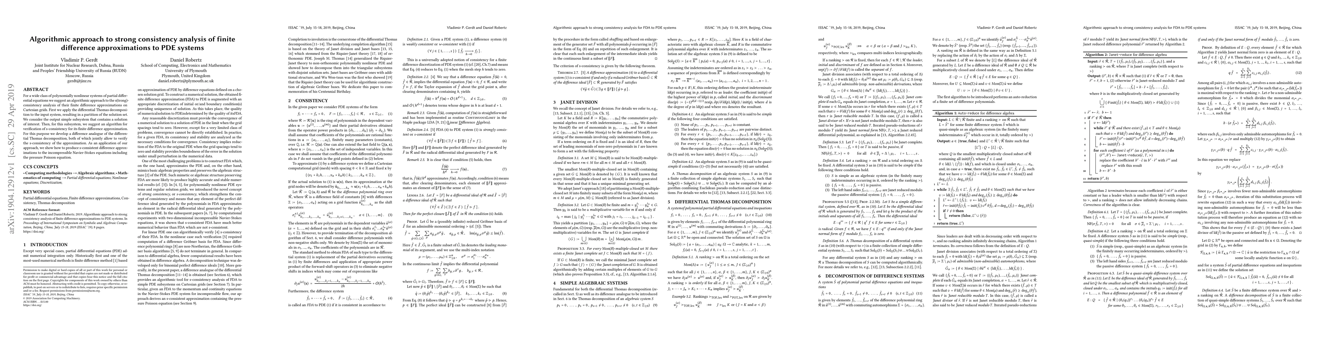 This paper proposes an algorithmic method for analyzing strong consistency in finite difference approximations of polynomially nonlinear PDE systems. It uses a differential Thomas decomposition and a difference analogue to verify s-consistency, demonstrating its application to the incompressible Navier-Stokes equations.