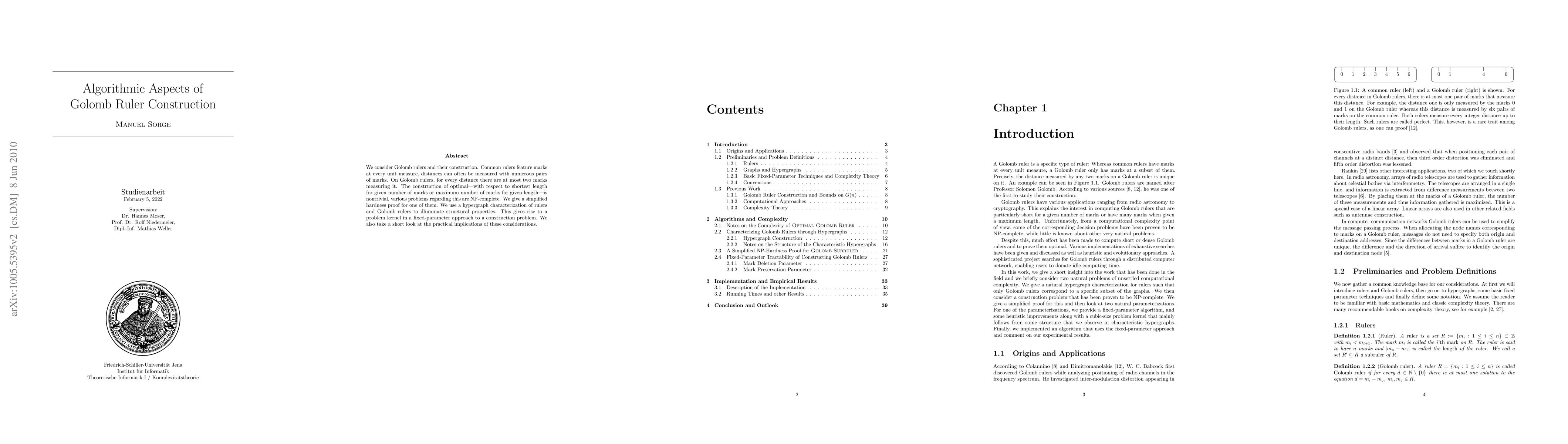 We consider Golomb rulers and their construction. Common rulers feature marks at every unit measure, distances can often be measured with numerous pairs of marks. On Golomb rulers, for every distance there are at most two marks measuring it. The construction of optimal---with respect to shortest length for given number of marks or maximum number of marks for given length---is nontrivial, various problems regarding this are NP-complete. We give a simplified hardness proof for one of them. We use a hypergraph characterization of rulers and Golomb rulers to illuminate structural properties. This gives rise to a problem kernel in a fixed-parameter approach to a construction problem. We also take a short look at the practical implications of these considerations.
