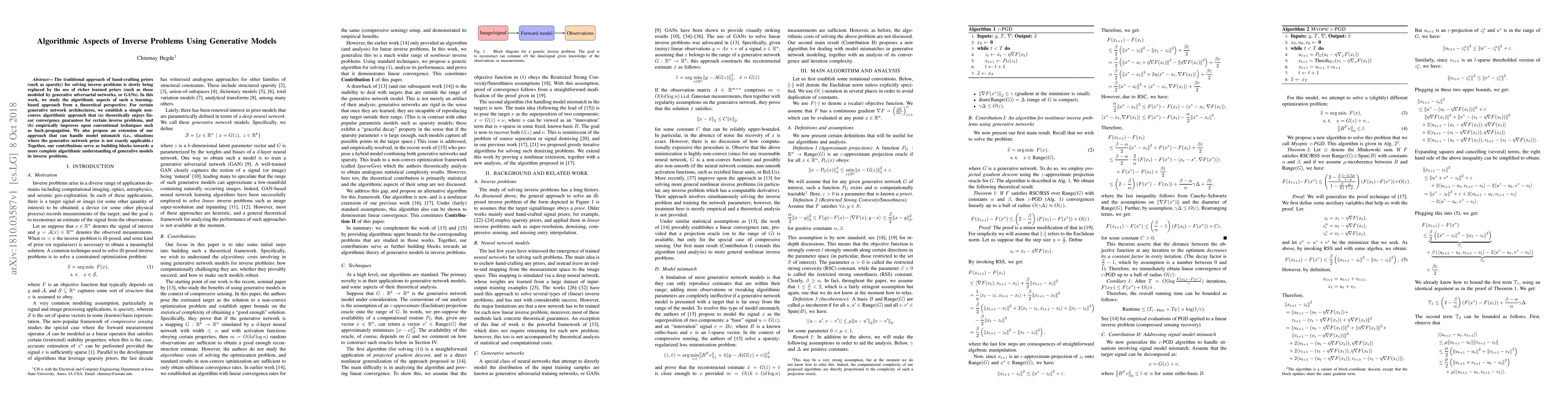 The traditional approach of hand-crafting priors (such as sparsity) for solving inverse problems is slowly being replaced by the use of richer learned priors (such as those modeled by generative adversarial networks, or GANs). In this work, we study the algorithmic aspects of such a learning-based approach from a theoretical perspective. For certain generative network architectures, we establish a simple non-convex algorithmic approach that (a) theoretically enjoys linear convergence guarantees for certain inverse problems, and (b) empirically improves upon conventional techniques such as back-propagation. We also propose an extension of our approach that can handle model mismatch (i.e., situations where the generative network prior is not exactly applicable.) Together, our contributions serve as building blocks towards a more complete algorithmic understanding of generative models in inverse problems.