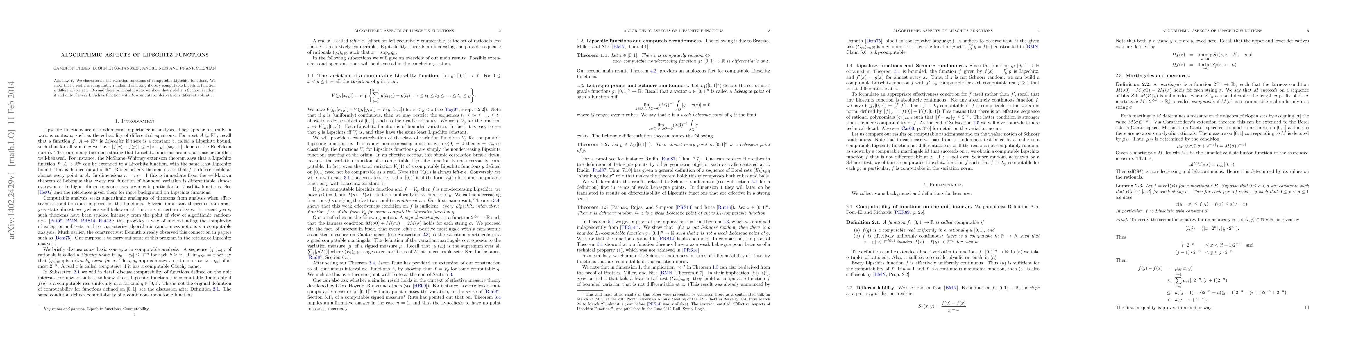 This paper characterizes computable Lipschitz functions and their relation to randomness, showing that a real z is random if every Lipschitz function is differentiable at z, or if its derivative is L1-computably.