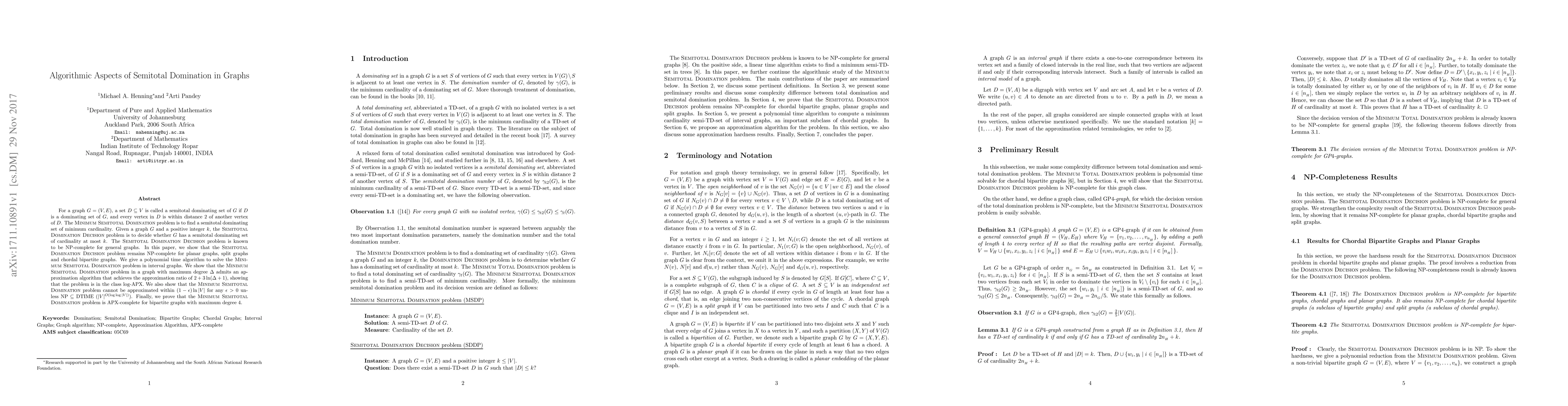 This paper studies the complexity and algorithmic aspects of the Semitotal Domination problem in graphs. It proves NP-completeness for planar, split, and chordal bipartite graphs but provides a polynomial-time algorithm for interval graphs. An approximation algorithm with a ratio of $2+3\ln(\Delta+1)$ is presented for general graphs, while inapproximability results are established for bipartite graphs with maximum degree 4.