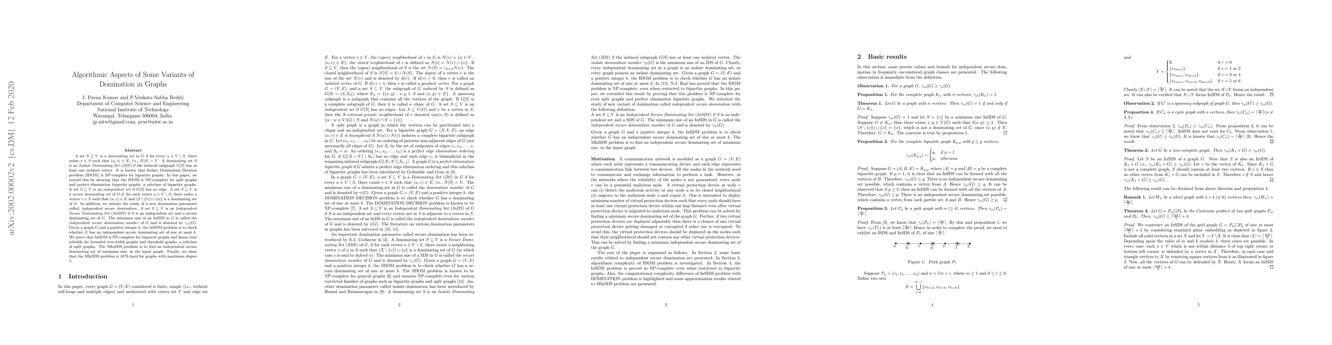 A set $S \subseteq V$ is a dominating set in G if for every u \in V \ S, there exists $v \in S$ such that $(u,v) \in E$, i.e., $N[S] = V$. A dominating set $S$ is an Isolate Dominating Set} (IDS) if the induced subgraph $G[S]$ has at least one isolated vertex. It is known that Isolate Domination Decision problem (IDOM) is NP-complete for bipartite graphs. In this paper, we extend this by showing that the IDOM is NP-complete for split graphs and perfect elimination bipartite graphs, a subclass of bipartite graphs. A set $S \subseteq V$ is an independent set if G[S] has no edge. A set S \subseteq V is a secure dominating set of $G$ if, for each vertex $u \in V \setminus S$, there exists a vertex $v \in S$ such that $ (u,v) \in E $ and $(S \ \{v\}) \cup \{u\}$ is a dominating set of $G$. In addition, we initiate the study of a new domination parameter called, independent secure domination. A set $S\subseteq V$ is an Independent Secure Dominating Set (InSDS) if $S$ is an independent set and a secure dominating set of $G$. The minimum size of an InSDS in $G$ is called the independent secure domination number of $G$ and is denoted by $\gamma_{is}(G)$. Given a graph $ G$ and a positive integer $ k,$ the InSDM problem is to check whether $ G $ has an independent secure dominating set of size at most $ k.$ We prove that InSDM is NP-complete for bipartite graphs and linear time solvable for bounded tree-width graphs and threshold graphs, a subclass of split graphs. The MInSDS problem is to find an independent secure dominating set of minimum size, in the input graph. Finally, we prove that the MInSDS problem is APX-hard for graphs with maximum degree $5.$