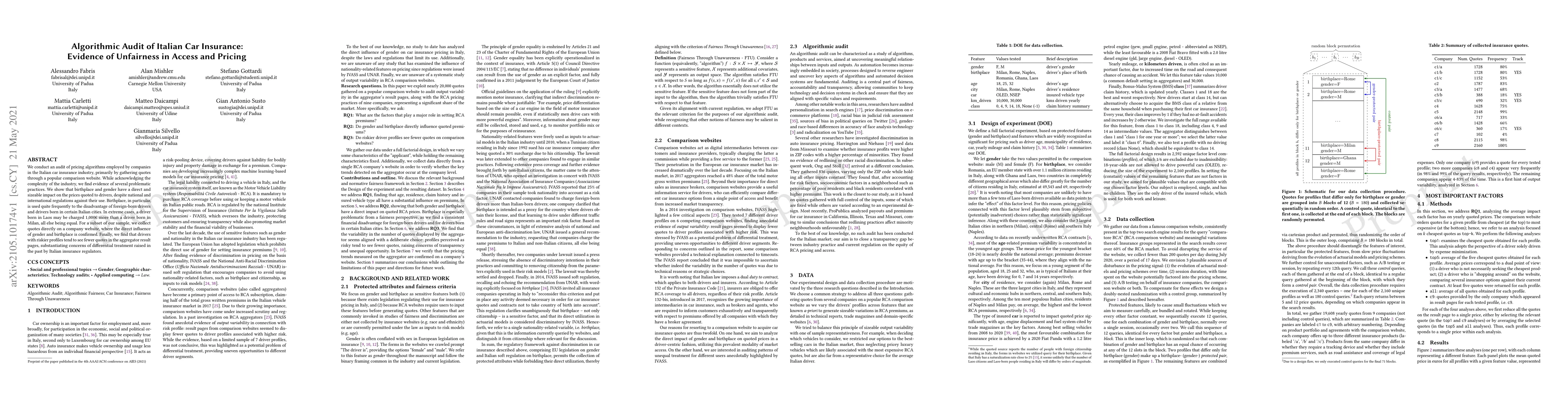 We conduct an audit of pricing algorithms employed by companies in the Italian car insurance industry, primarily by gathering quotes through a popular comparison website. While acknowledging the complexity of the industry, we find evidence of several problematic practices. We show that birthplace and gender have a direct and sizeable impact on the prices quoted to drivers, despite national and international regulations against their use. Birthplace, in particular, is used quite frequently to the disadvantage of foreign-born drivers and drivers born in certain Italian cities. In extreme cases, a driver born in Laos may be charged 1,000 euros more than a driver born in Milan, all else being equal. For a subset of our sample, we collect quotes directly on a company website, where the direct influence of gender and birthplace is confirmed. Finally, we find that drivers with riskier profiles tend to see fewer quotes in the aggregator result pages, substantiating concerns of differential treatment raised in the past by Italian insurance regulators.