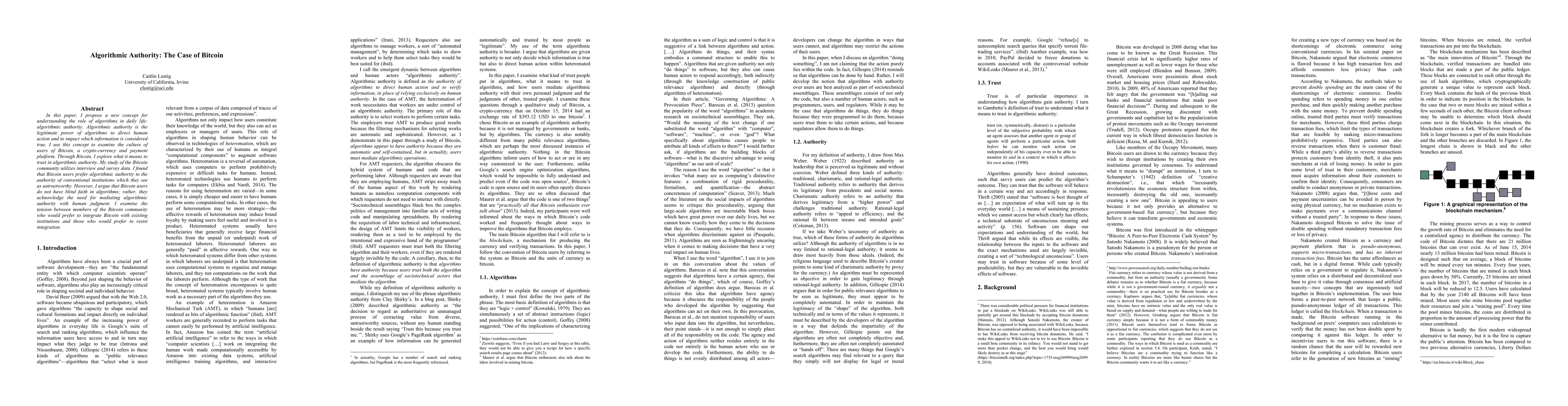 A study of Bitcoin users found that they trust algorithmic authority over conventional institutions, but also acknowledge the need for human judgment to balance it. Users have differing opinions on integrating Bitcoin with existing institutions, reflecting a tension between those who want to embrace and resist algorithmic authority.