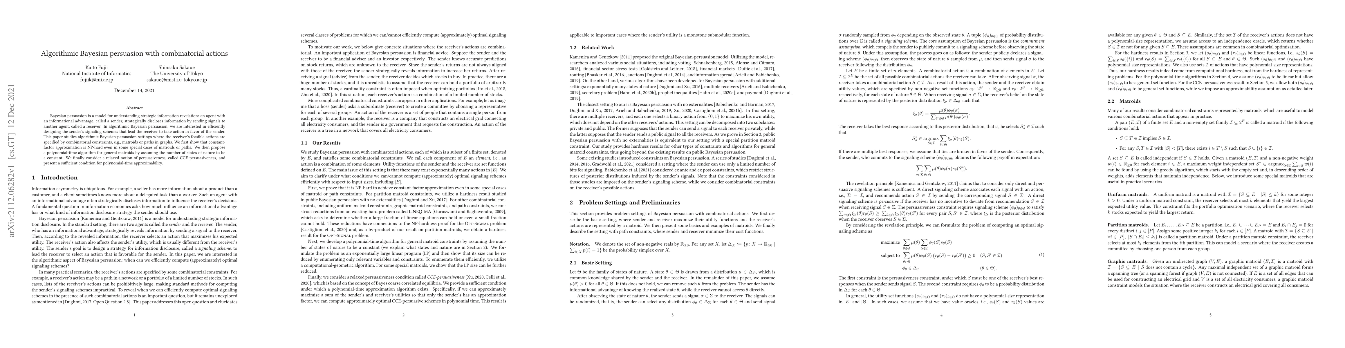 This paper explores algorithmic Bayesian persuasion in scenarios where receivers' actions are constrained by combinatorial structures like matroids or graph paths. It demonstrates the NP-hardness of constant-factor approximation in specific cases and proposes a polynomial-time algorithm for matroids under a constant number of states. It also introduces CCE-persuasiveness and provides a condition for its approximability.
